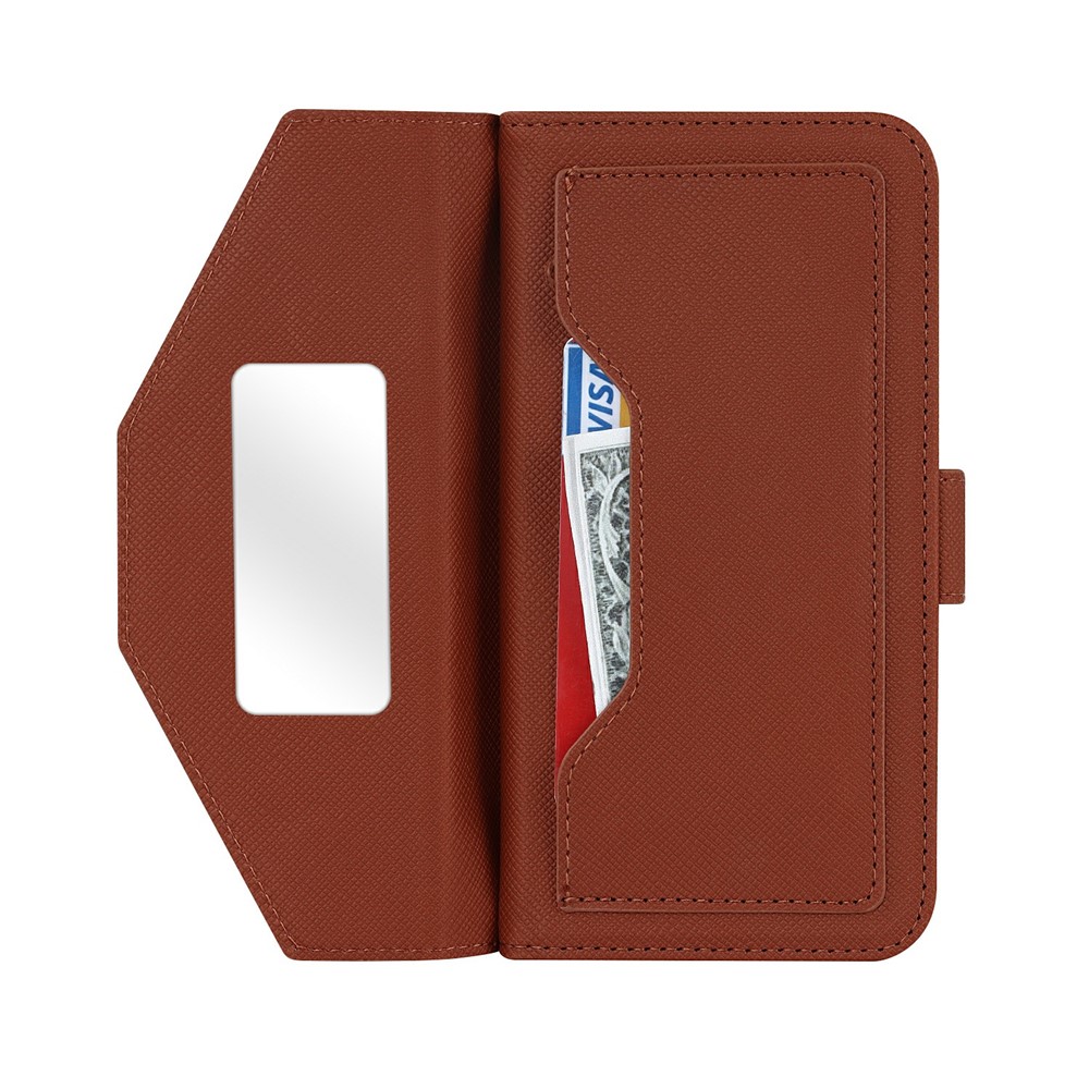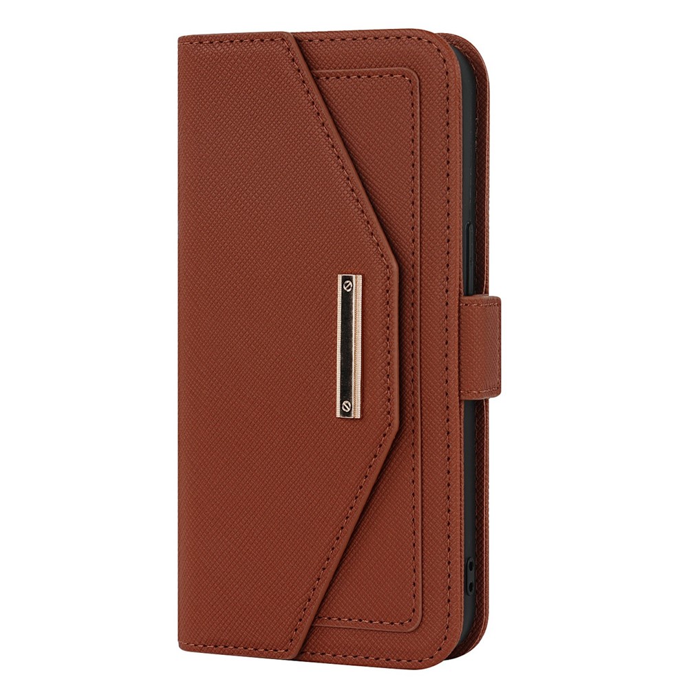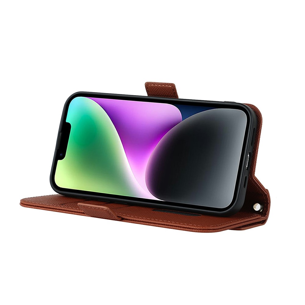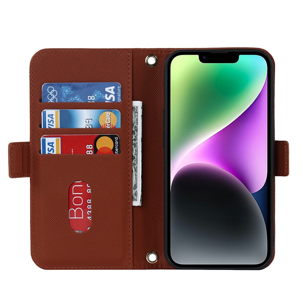 For iPhone 15 Stand Case Cross Texture PU Leather Wallet Phone Cover with Shoulder Strap / Makeup Mirror - Brown $20.86