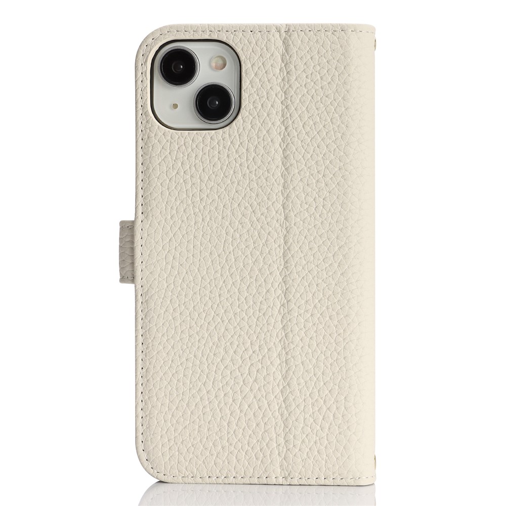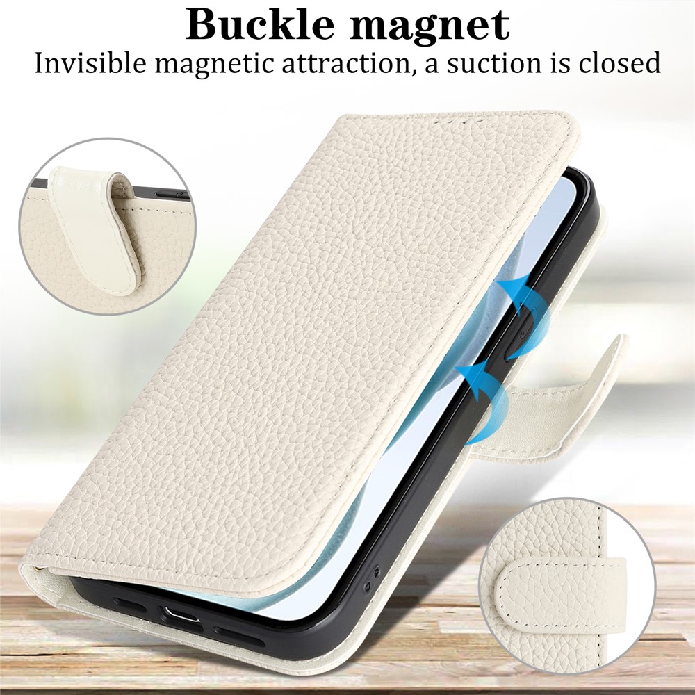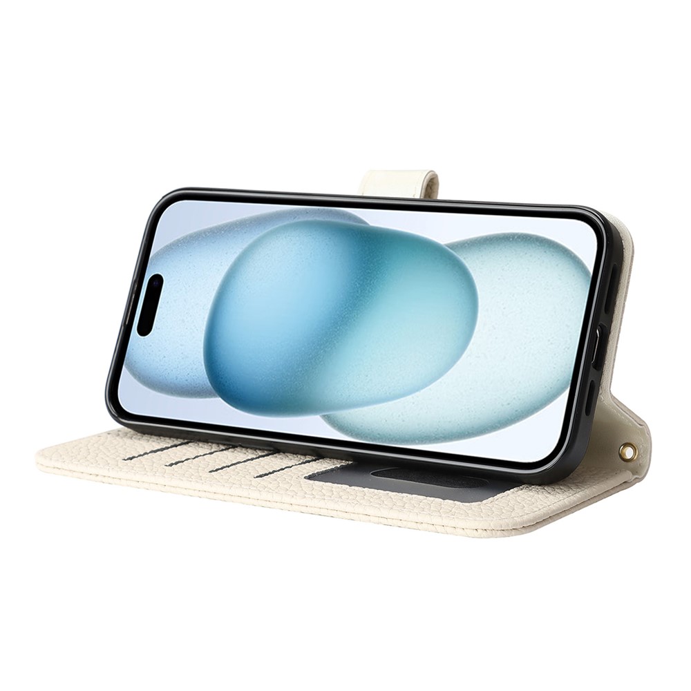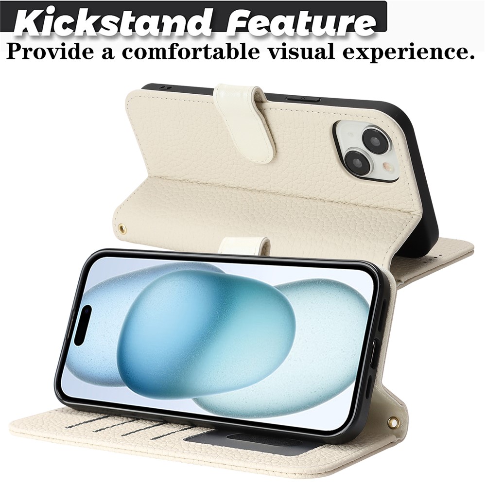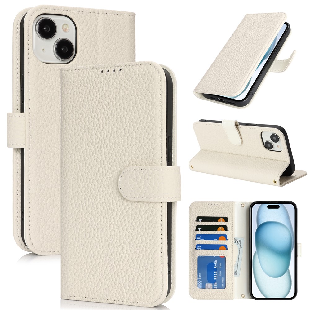 For iPhone 15 Stand Case Litchi Texture Genuine Cow Leather Wallet Phone Cover RFID Blocking – White