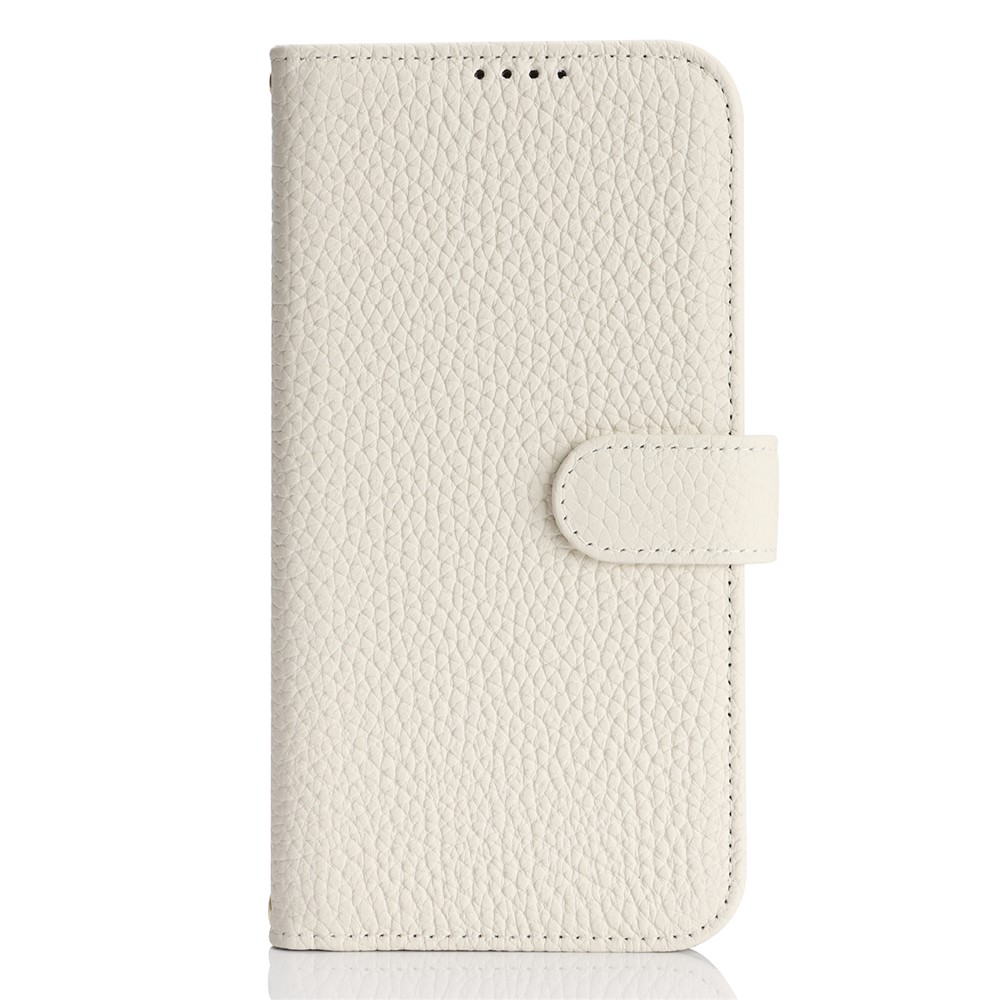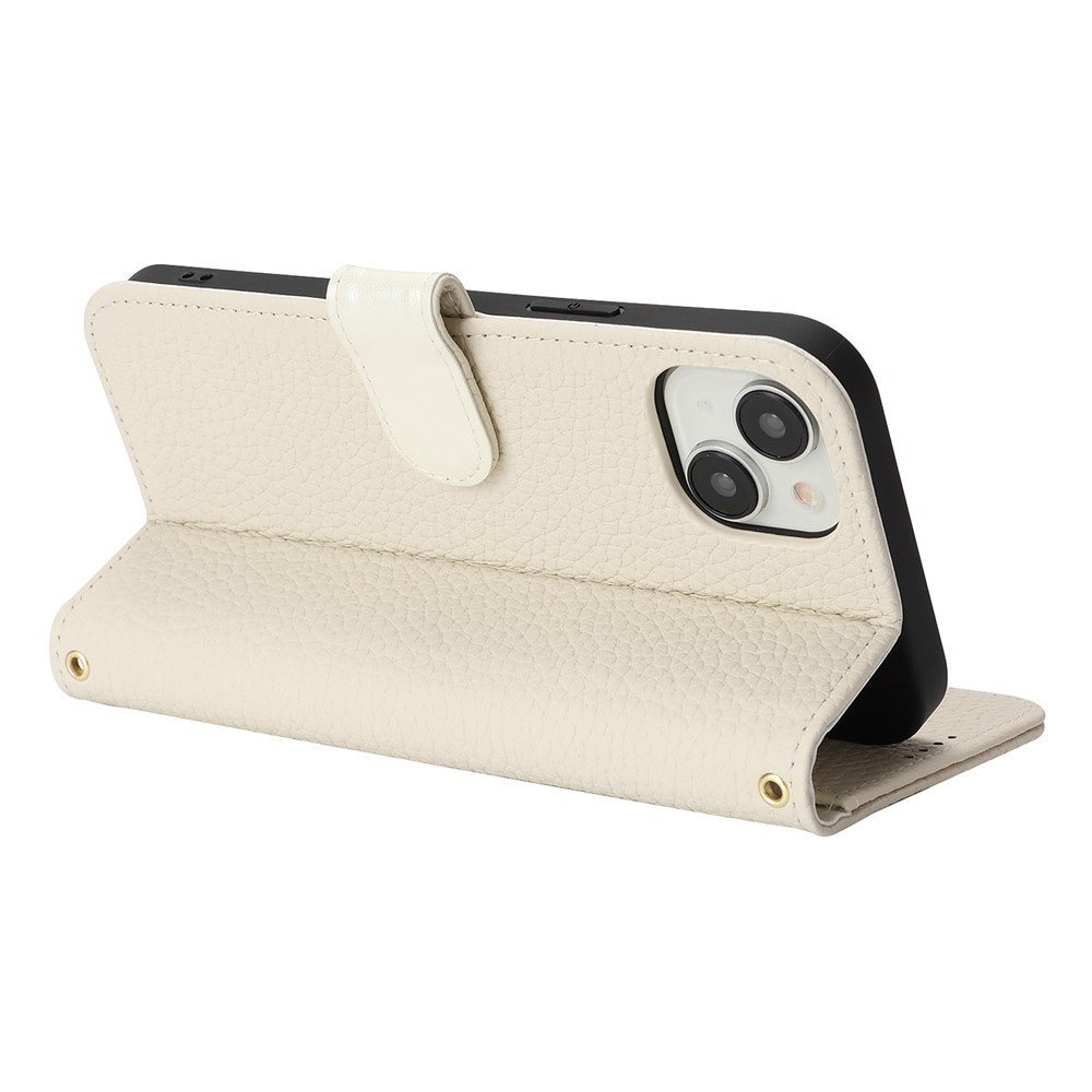 For iPhone 15 Stand Case Litchi Texture Genuine Cow Leather Wallet Phone Cover RFID Blocking - White