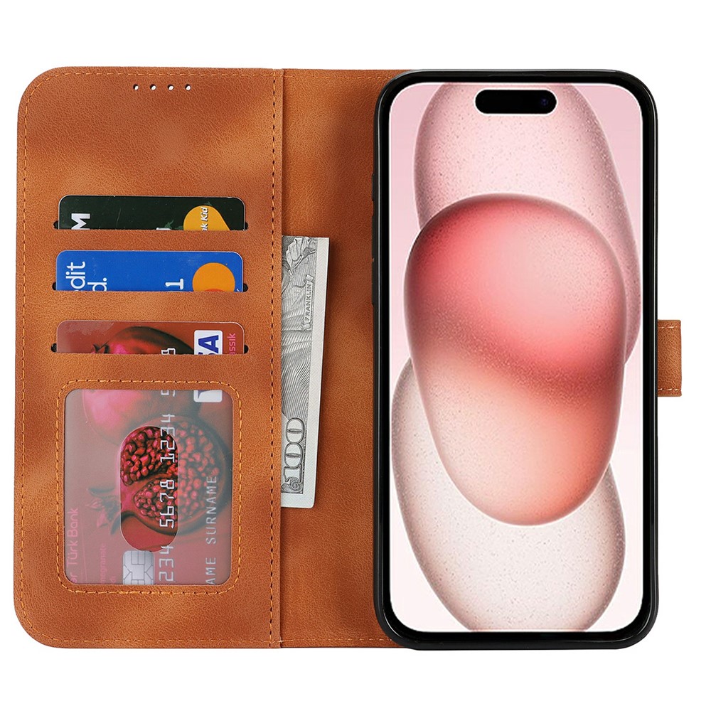 • For iPhone 15 Wallet Case Double Folded Edge Skin Touch PU Leather Flip Phone Cover - Dark Brown