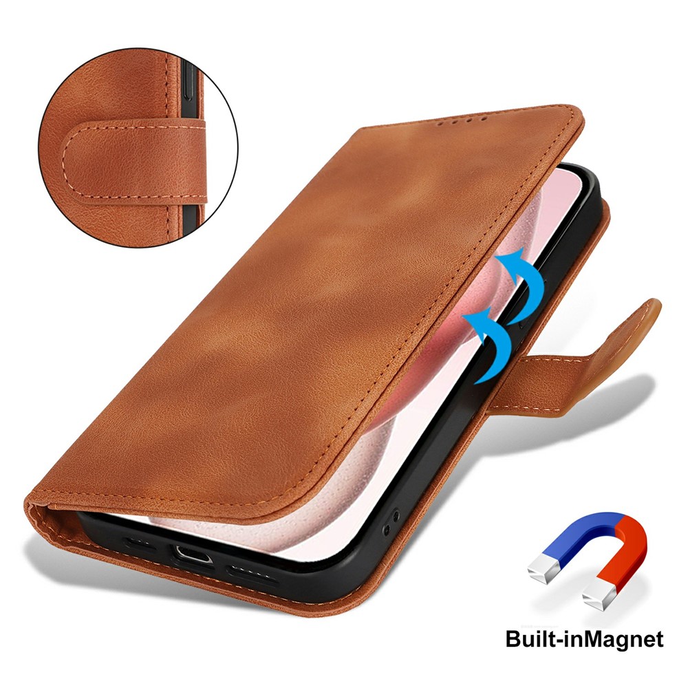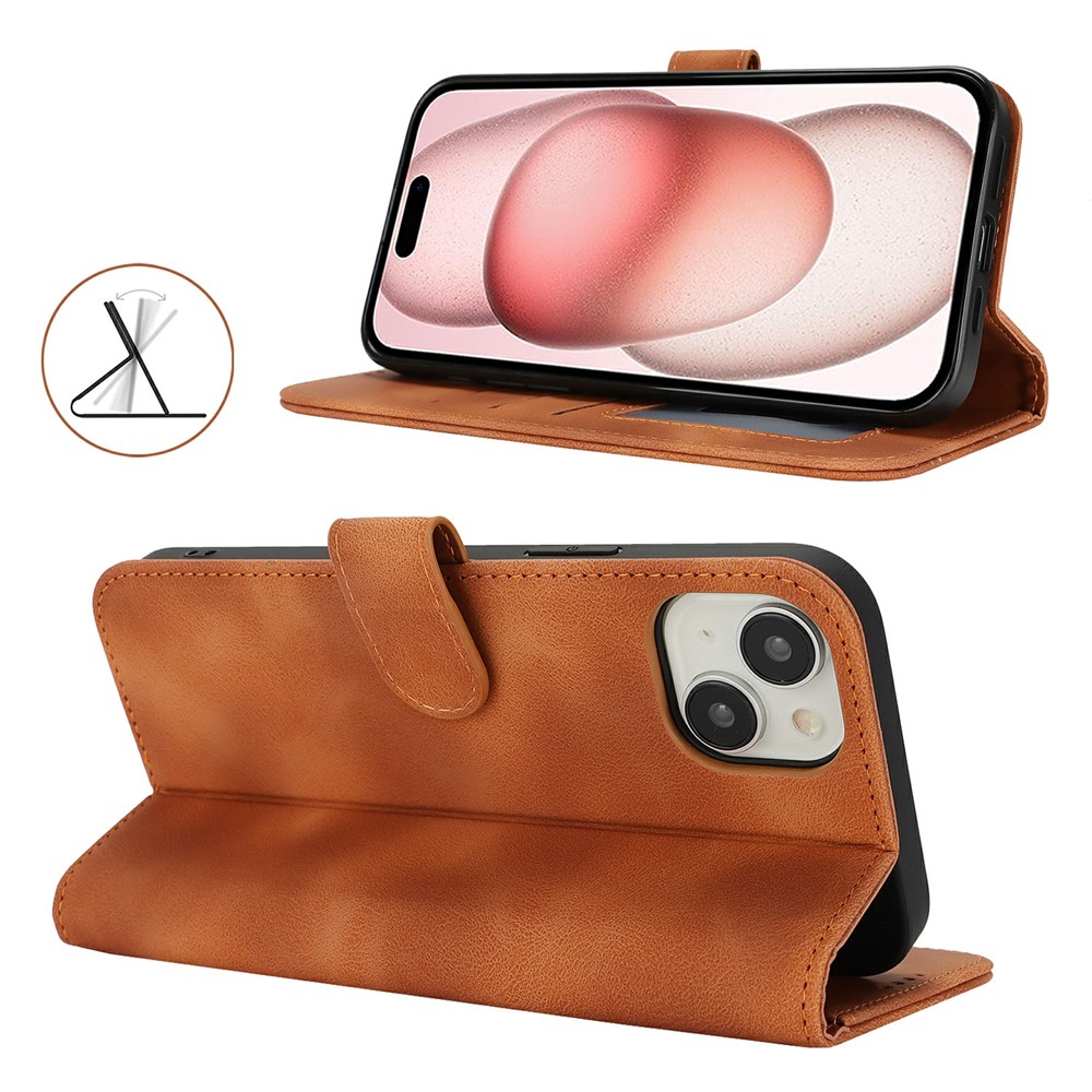 For iPhone 15 Wallet Case Double Folded Edge Skin Touch PU Leather Flip Phone Cover – Light Brown