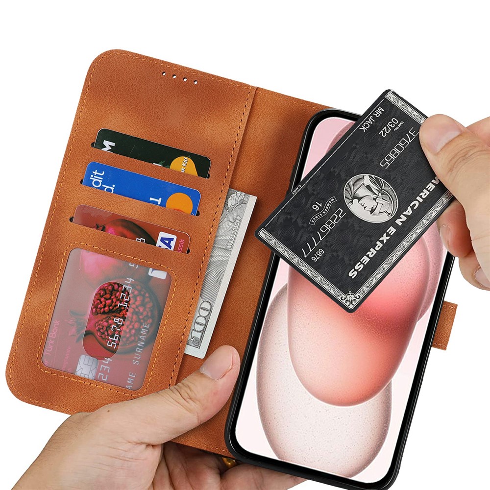 For iPhone 15 Wallet Case Double Folded Edge Skin Touch PU Leather Flip Phone Cover - Light Brown $17.28
