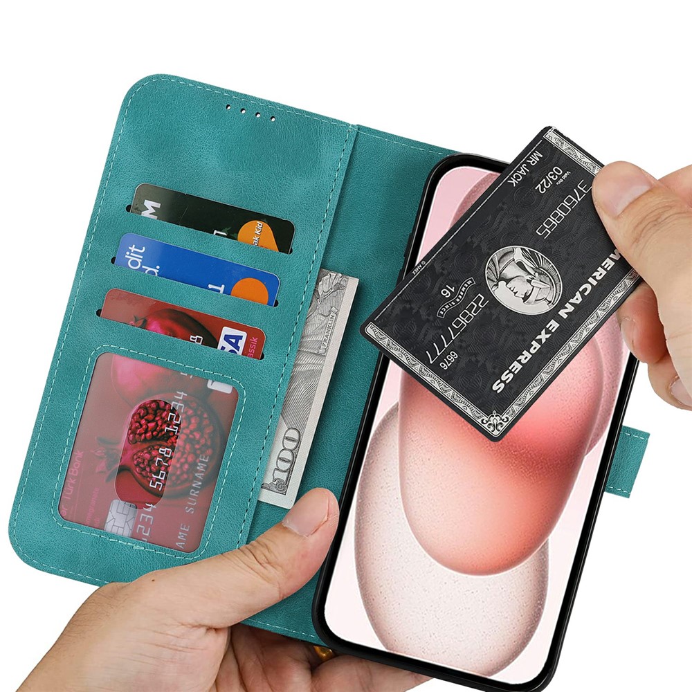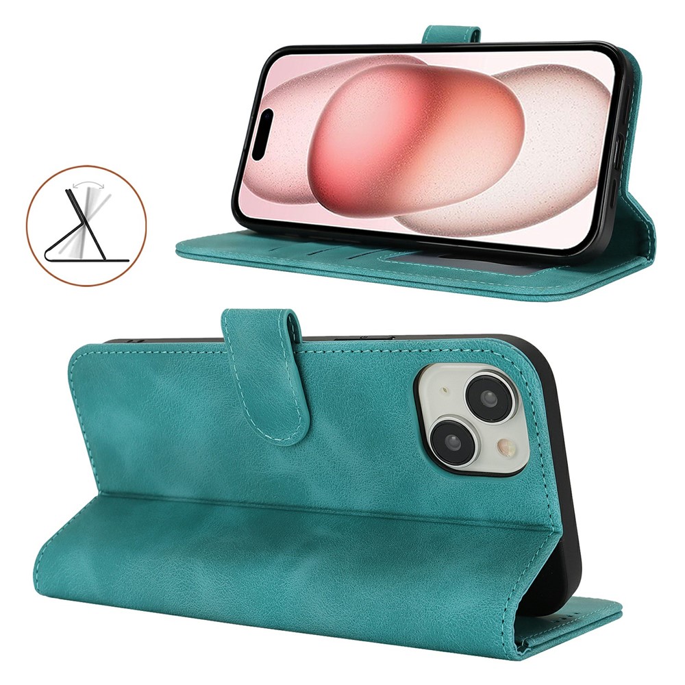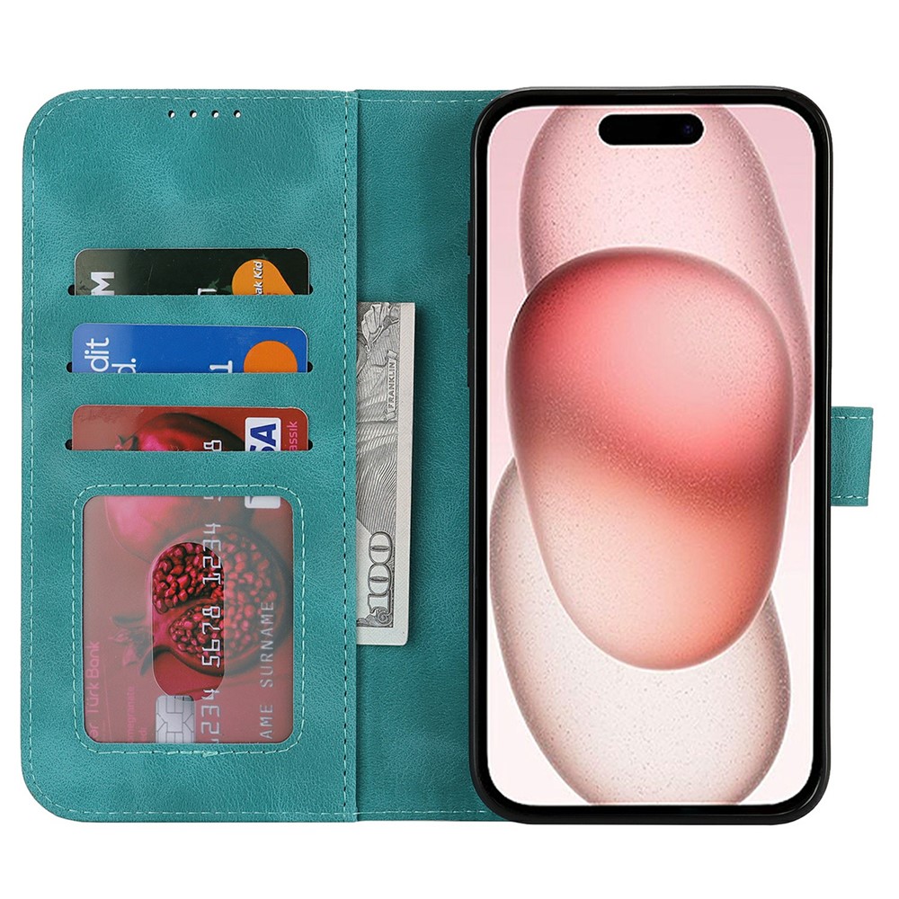 For iPhone 15 Wallet Case Double Folded Edge Skin Touch PU Leather Flip Phone Cover - Mint Green