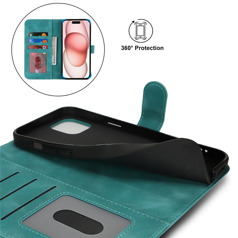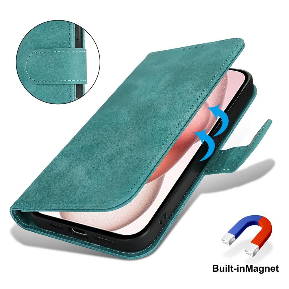 For iPhone 15 Wallet Case Double Folded Edge Skin Touch PU Leather Flip Phone Cover – Mint Green
