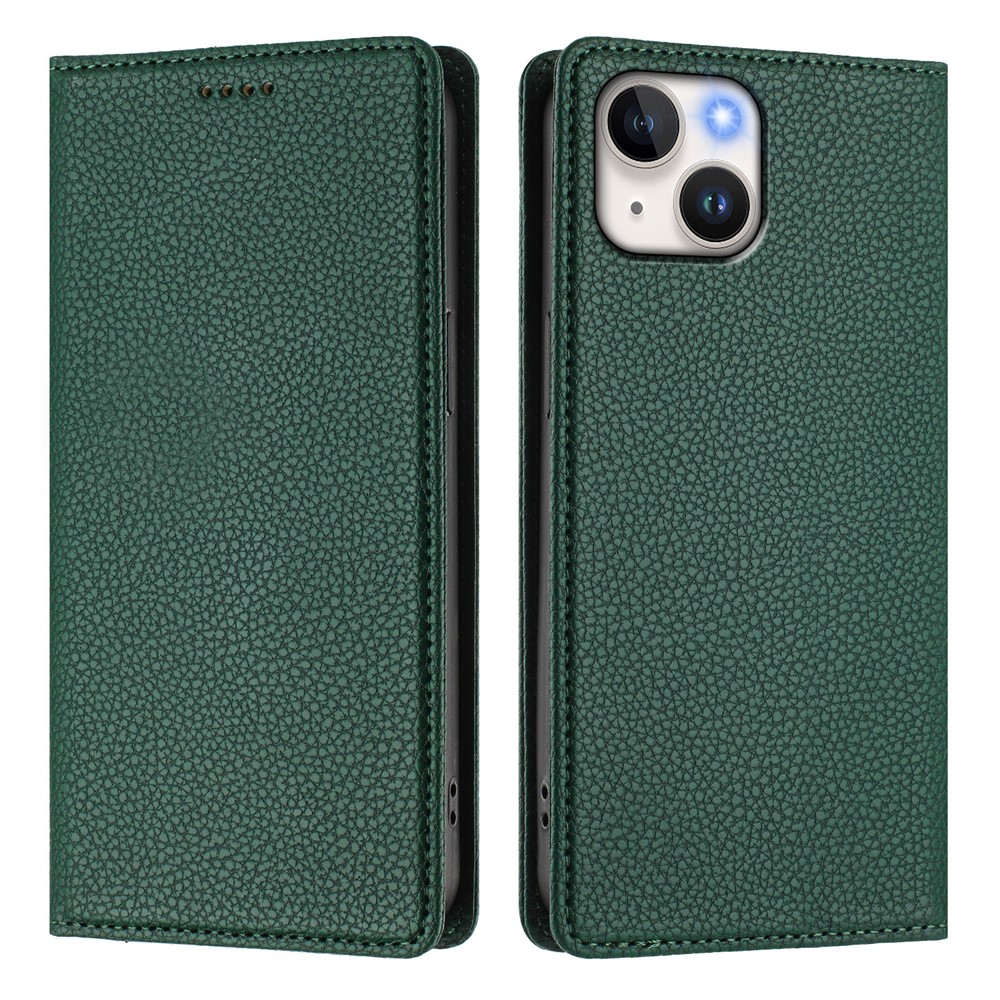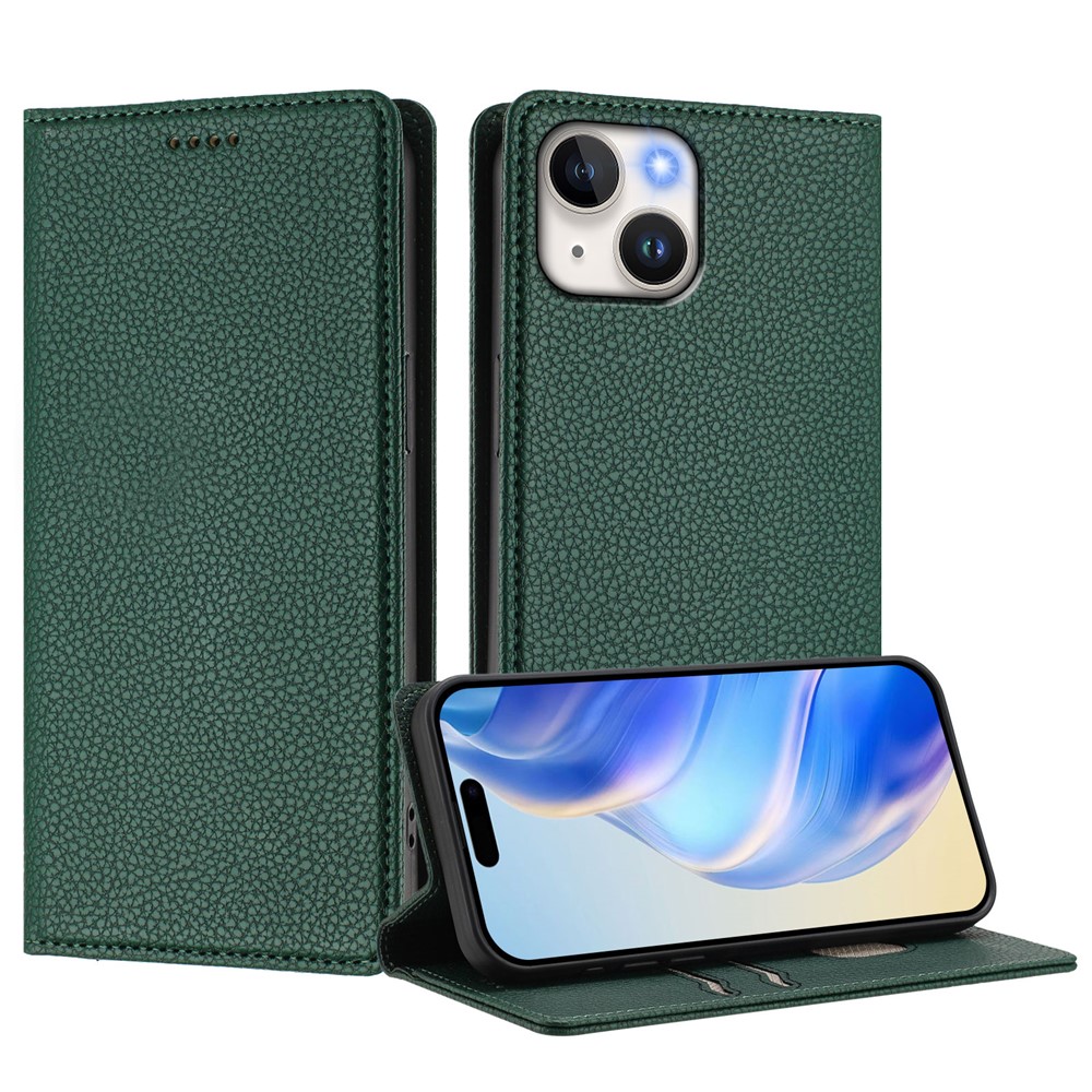 For iPhone 15 Wallet Case RFID Blocking Litchi Texture Leather Mobile Cover – Dark Green