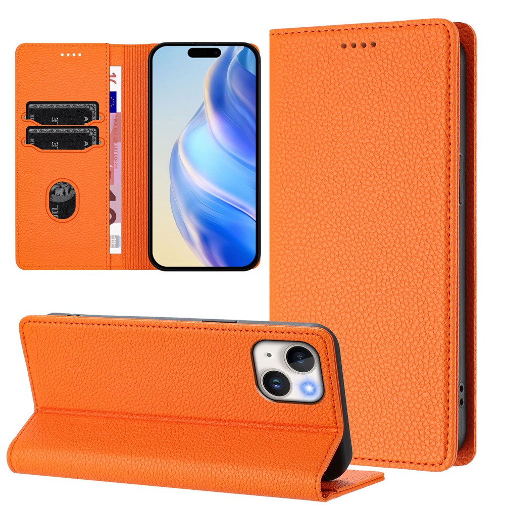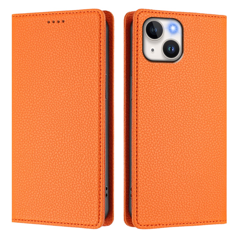 For iPhone 15 Wallet Case RFID Blocking Litchi Texture Leather Mobile Cover – Orange