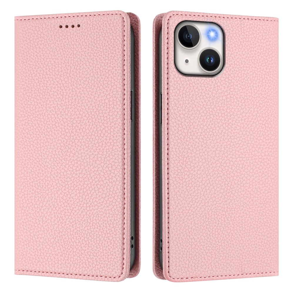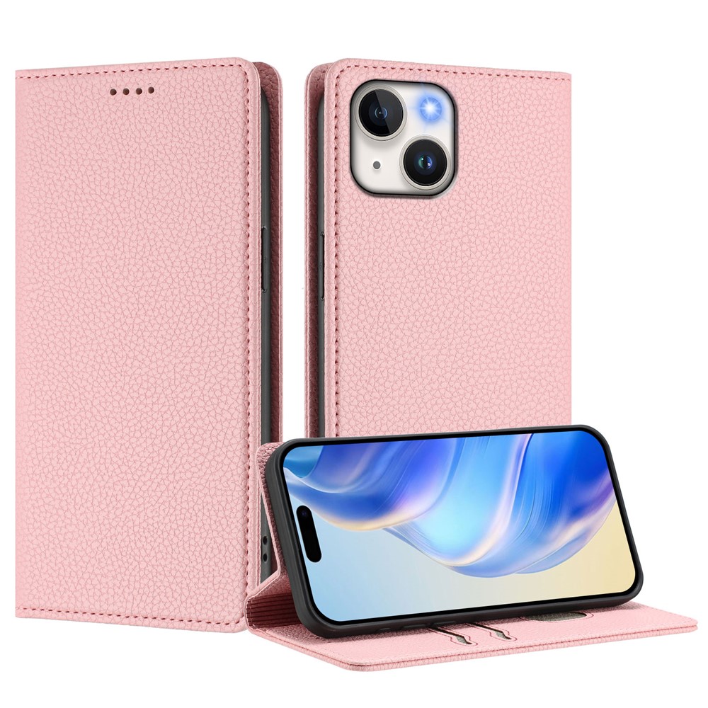 For iPhone 15 Wallet Case RFID Blocking Litchi Texture Leather Mobile Cover – Pink