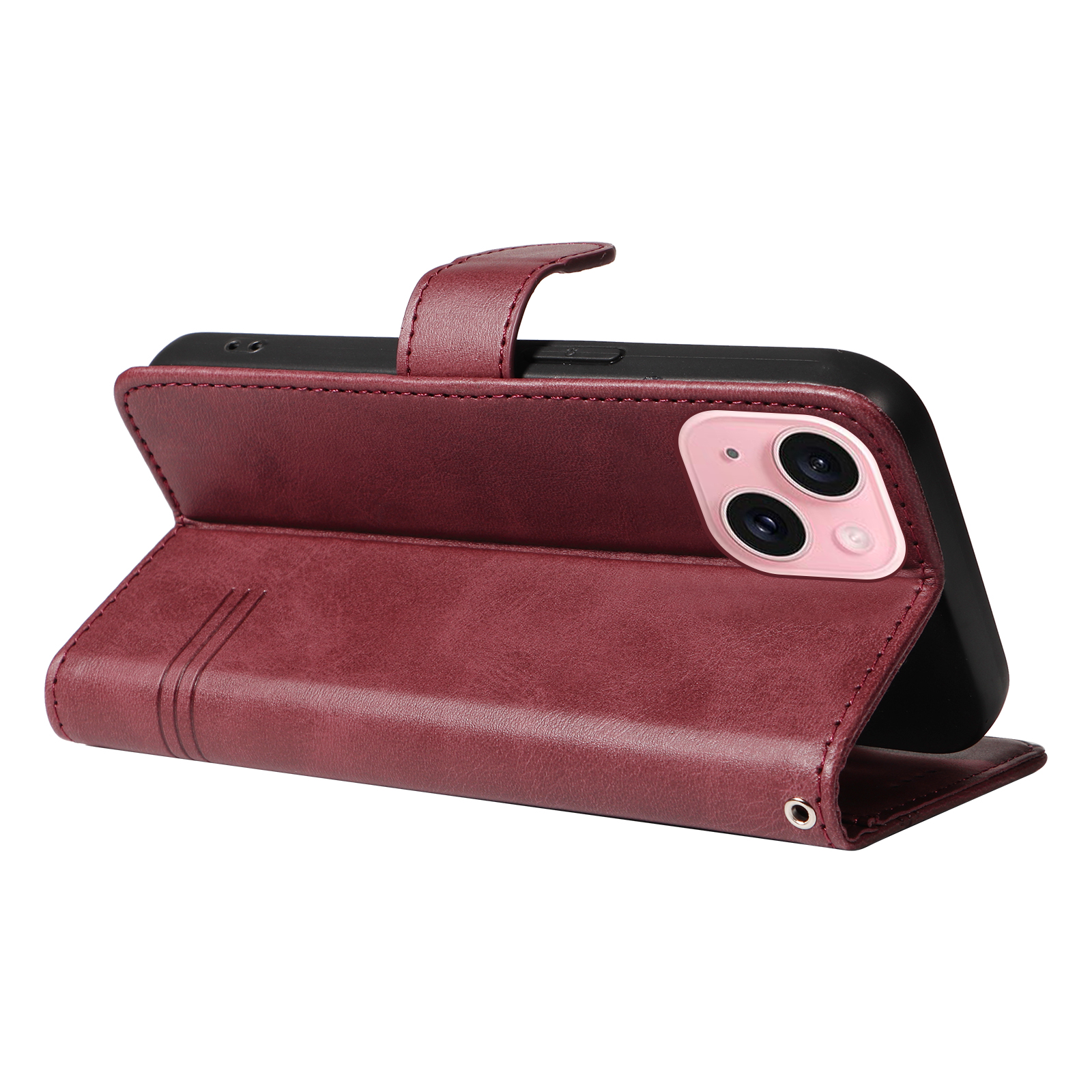 For iPhone 15 Wallet Case T-Shape Lines Leather Phone Cover Stand - Wine Red