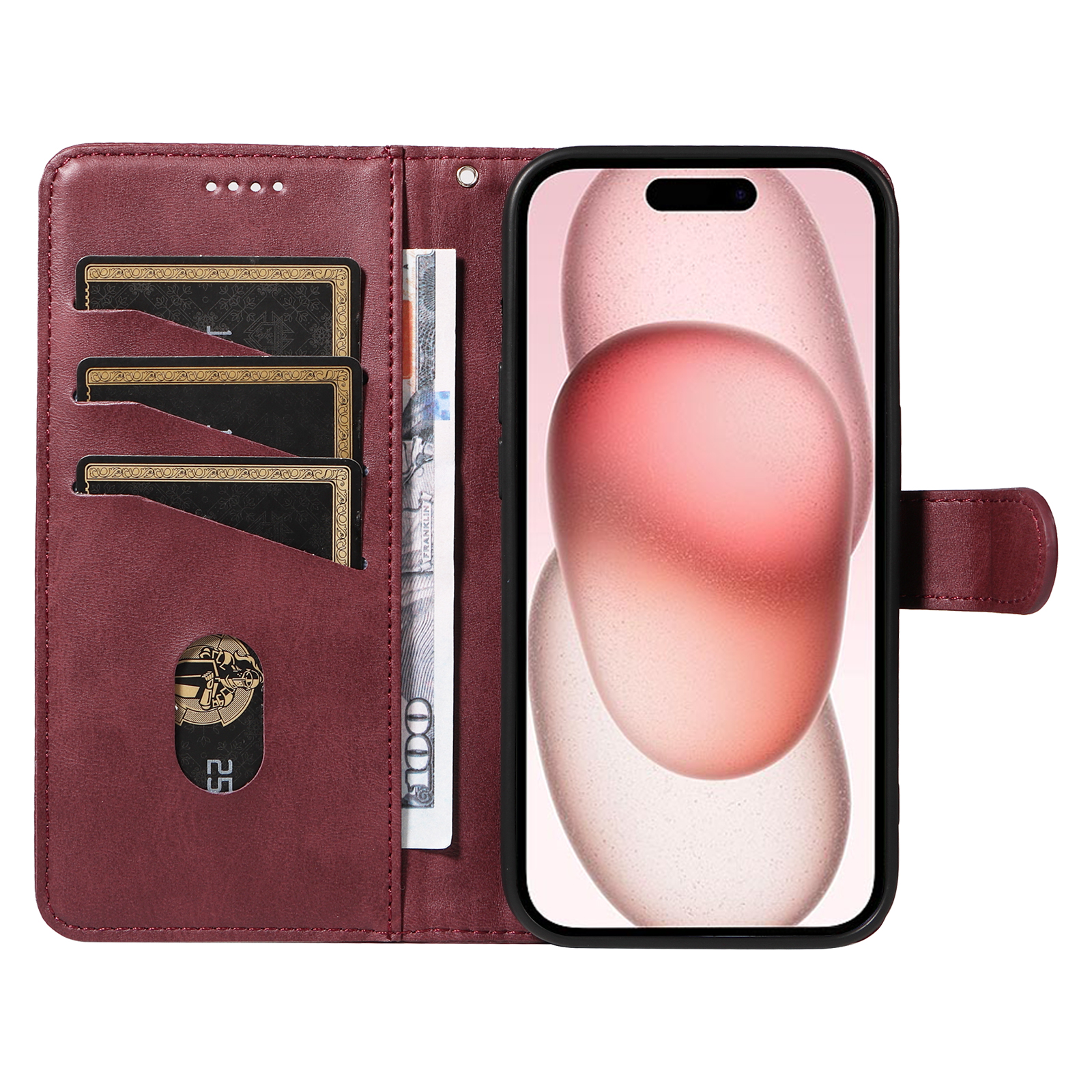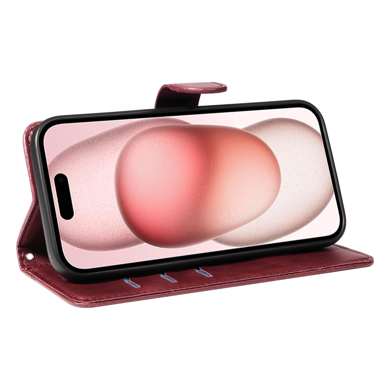 For iPhone 15 Wallet Case T-Shape Lines Leather Phone Cover Stand – Wine Red