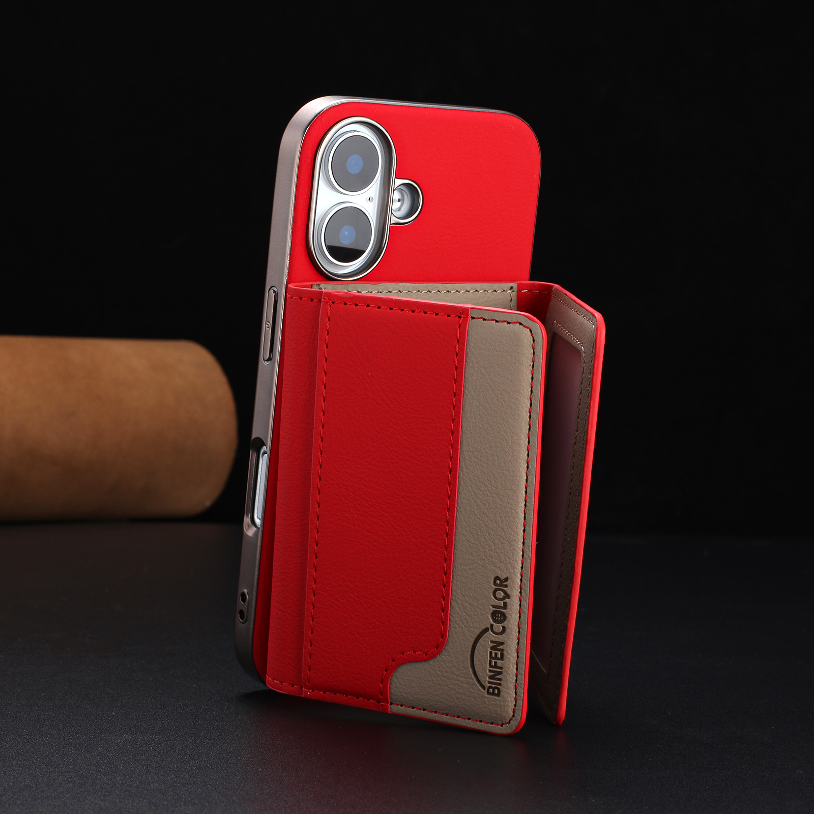 For iPhone 16 Case BINFEN COLOR BF37 Color Splicing Magnetic Card Holder Leather Back Cover - Red $20.53