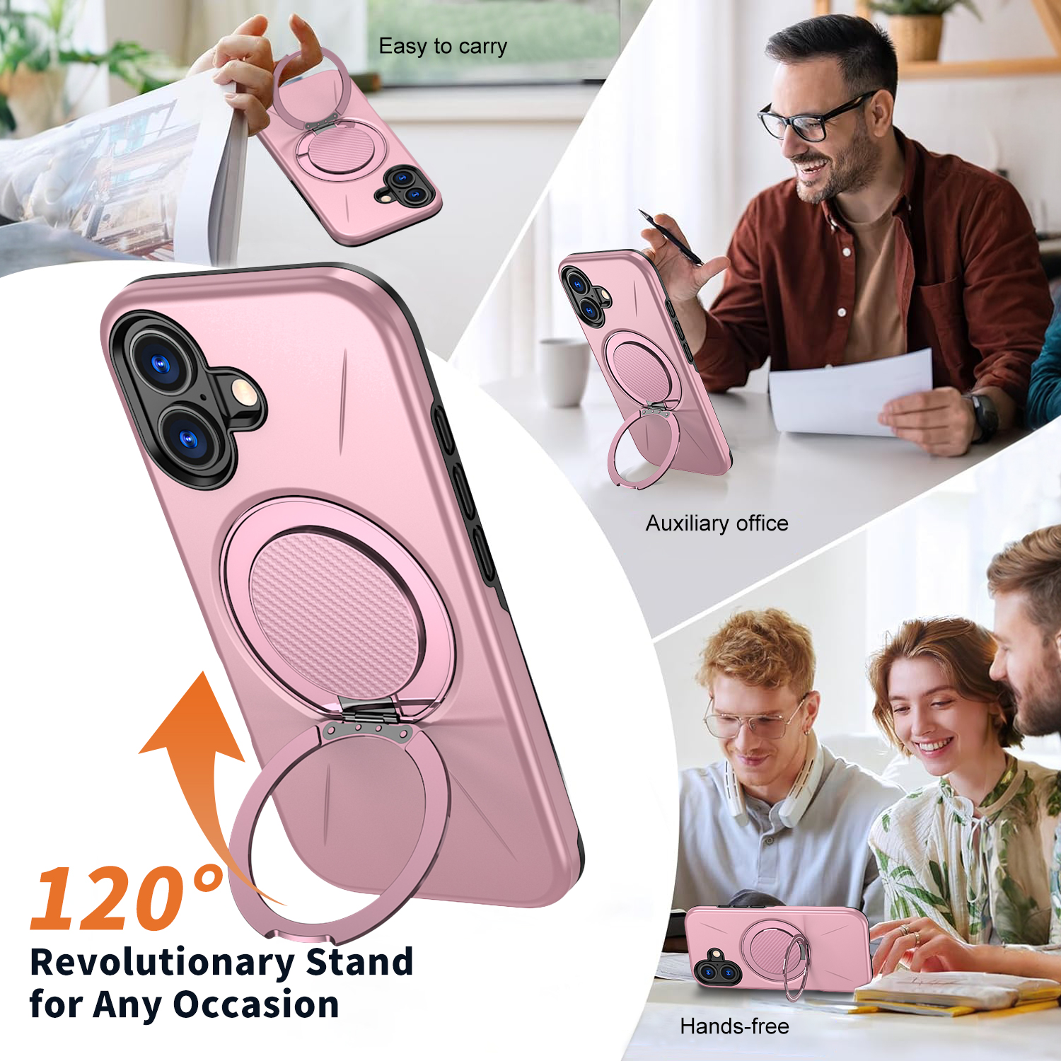 For iPhone 16 Case Compatible with MagSafe TPU + PC Back Cover with Rotating Kickstand – Pink