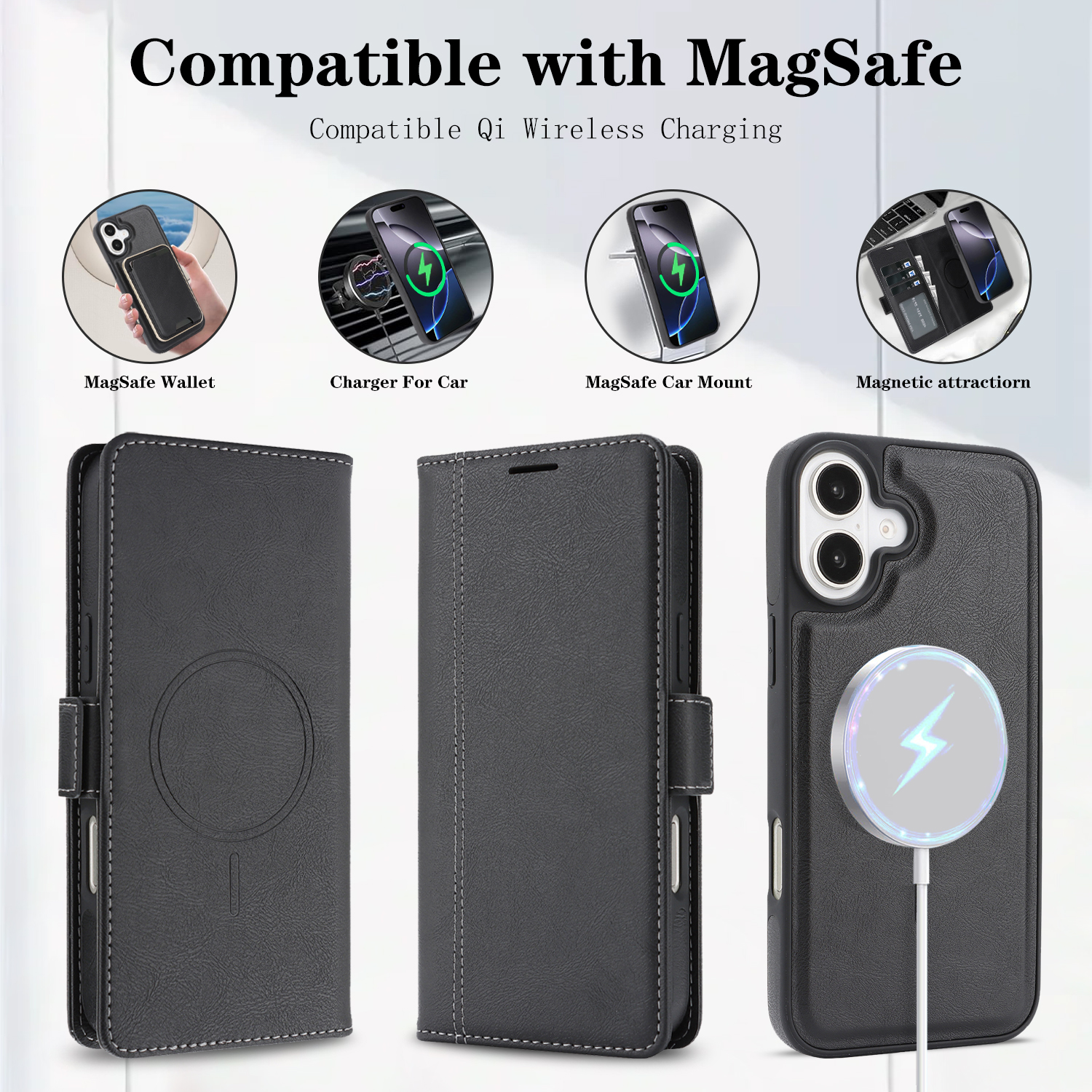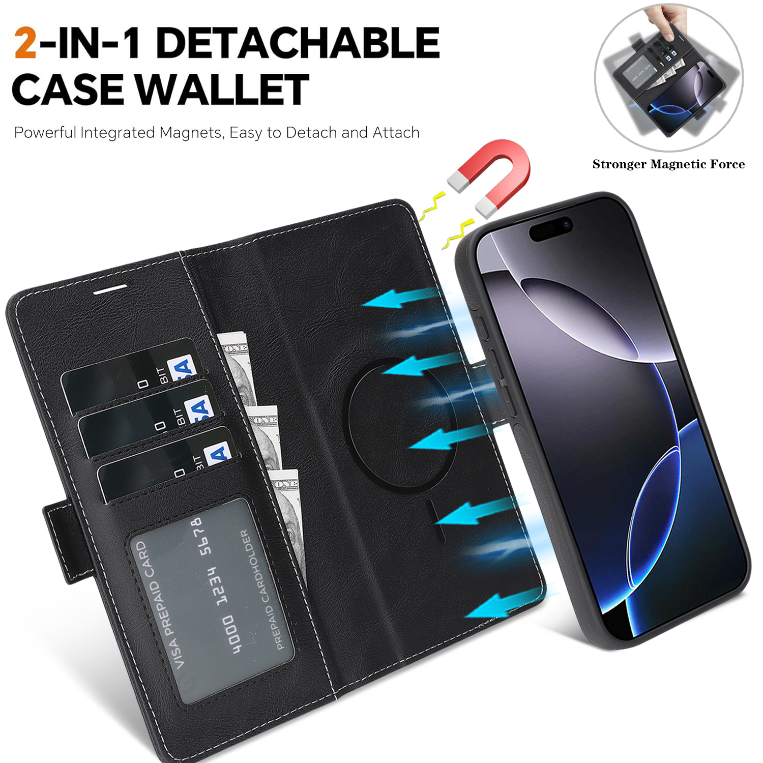 For iPhone 16 Case Detachable 2 in 1 Leather Wallet Phone Cover Compatible with MagSafe – Black