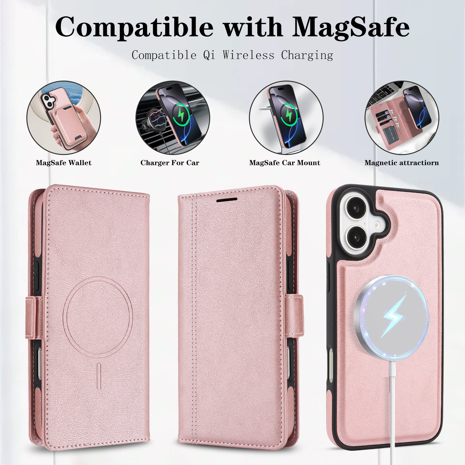 For iPhone 16 Case Detachable 2 in 1 Leather Wallet Phone Cover Compatible with MagSafe – Pink