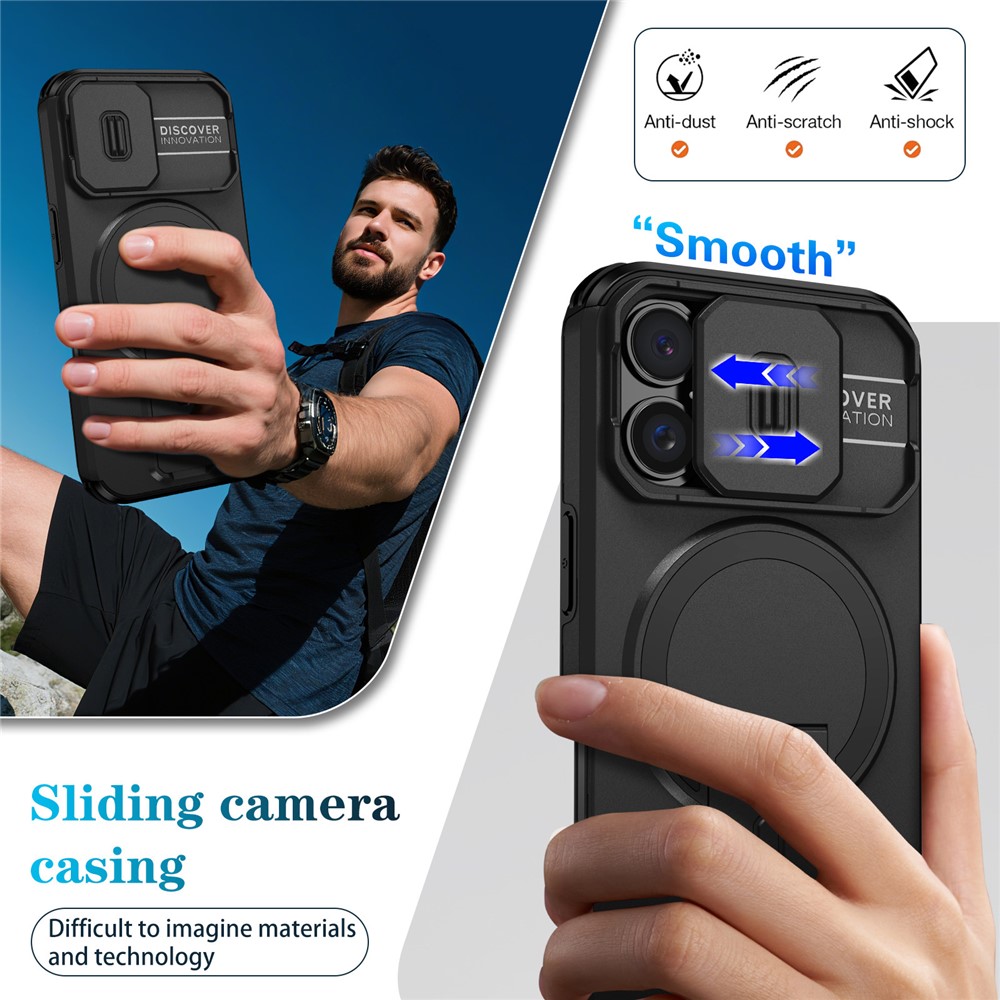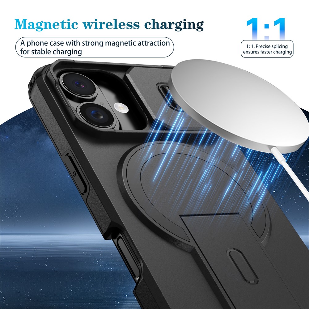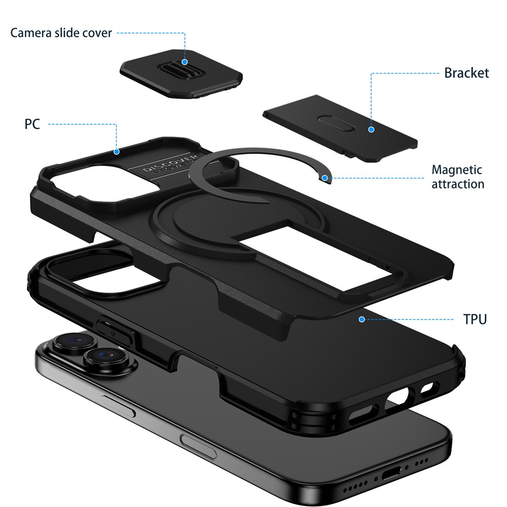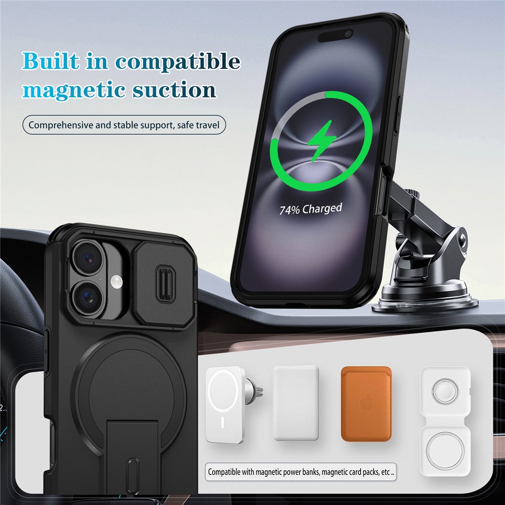 For iPhone 16 Case Kickstand Camera Slider PC + TPU Phone Cover Compatible with MagSafe - Black