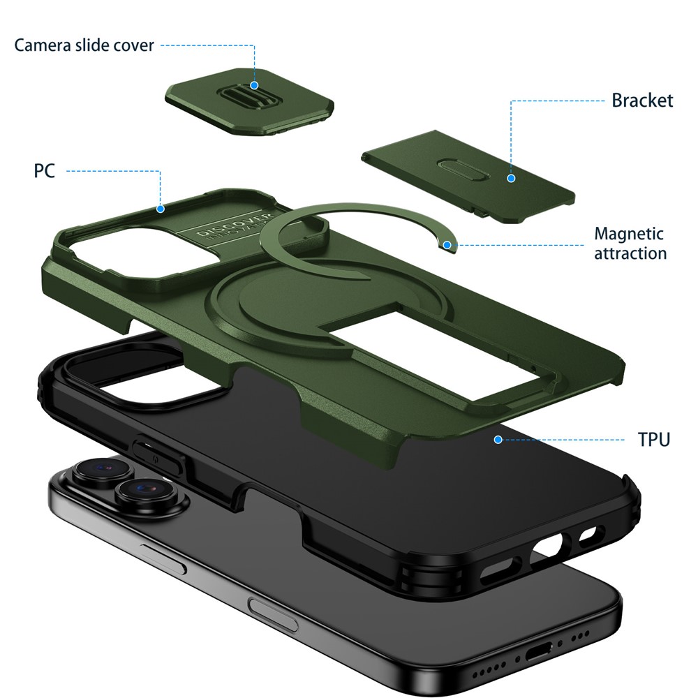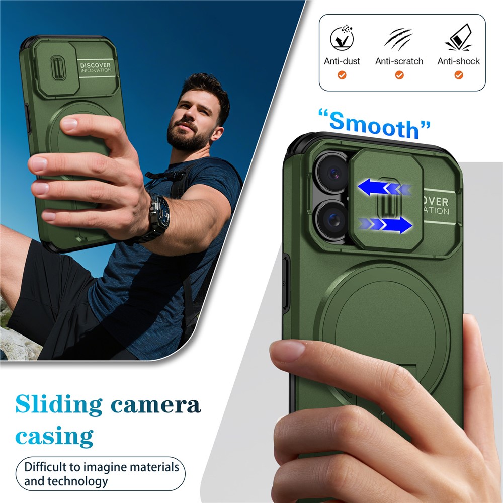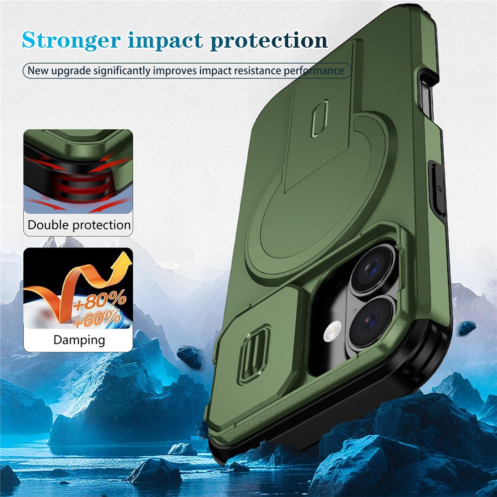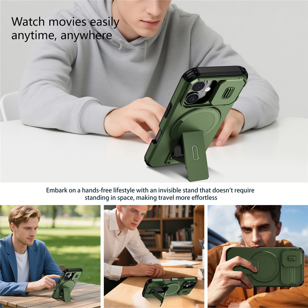 For iPhone 16 Case Kickstand Camera Slider PC + TPU Phone Cover Compatible with MagSafe - Green $15.05