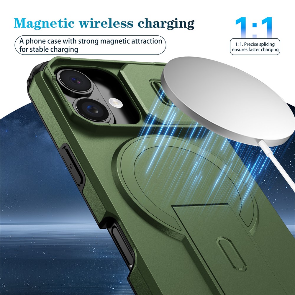 For iPhone 16 Case Kickstand Camera Slider PC + TPU Phone Cover Compatible with MagSafe – Green