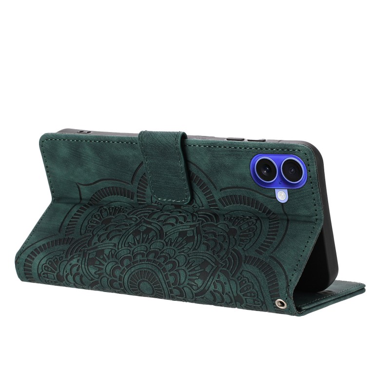 For iPhone 16 Case with 2Pcs Tempered Glass WANLONFENG MTL Series Mandala Leather Phone Cover - Midnight Green $17.36
