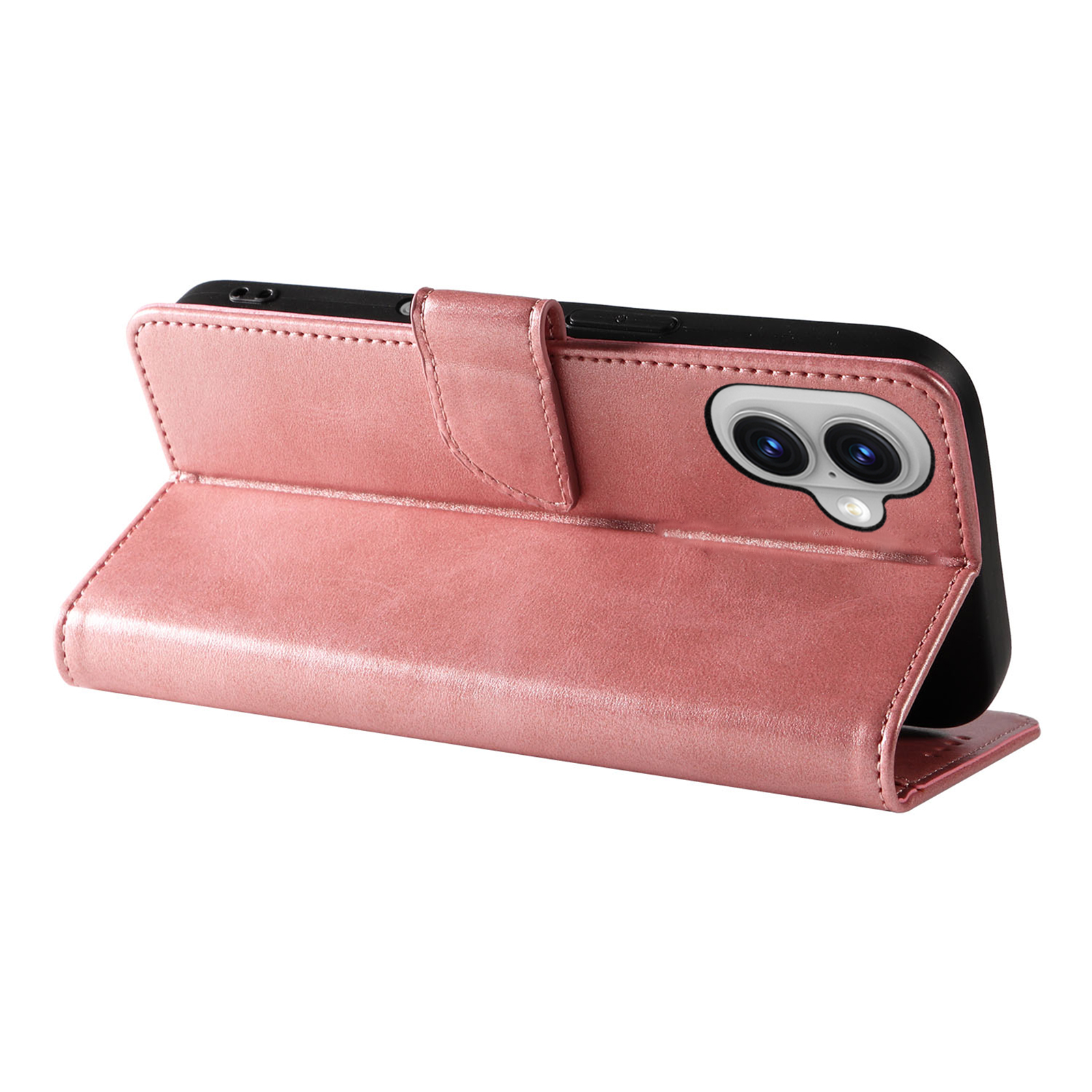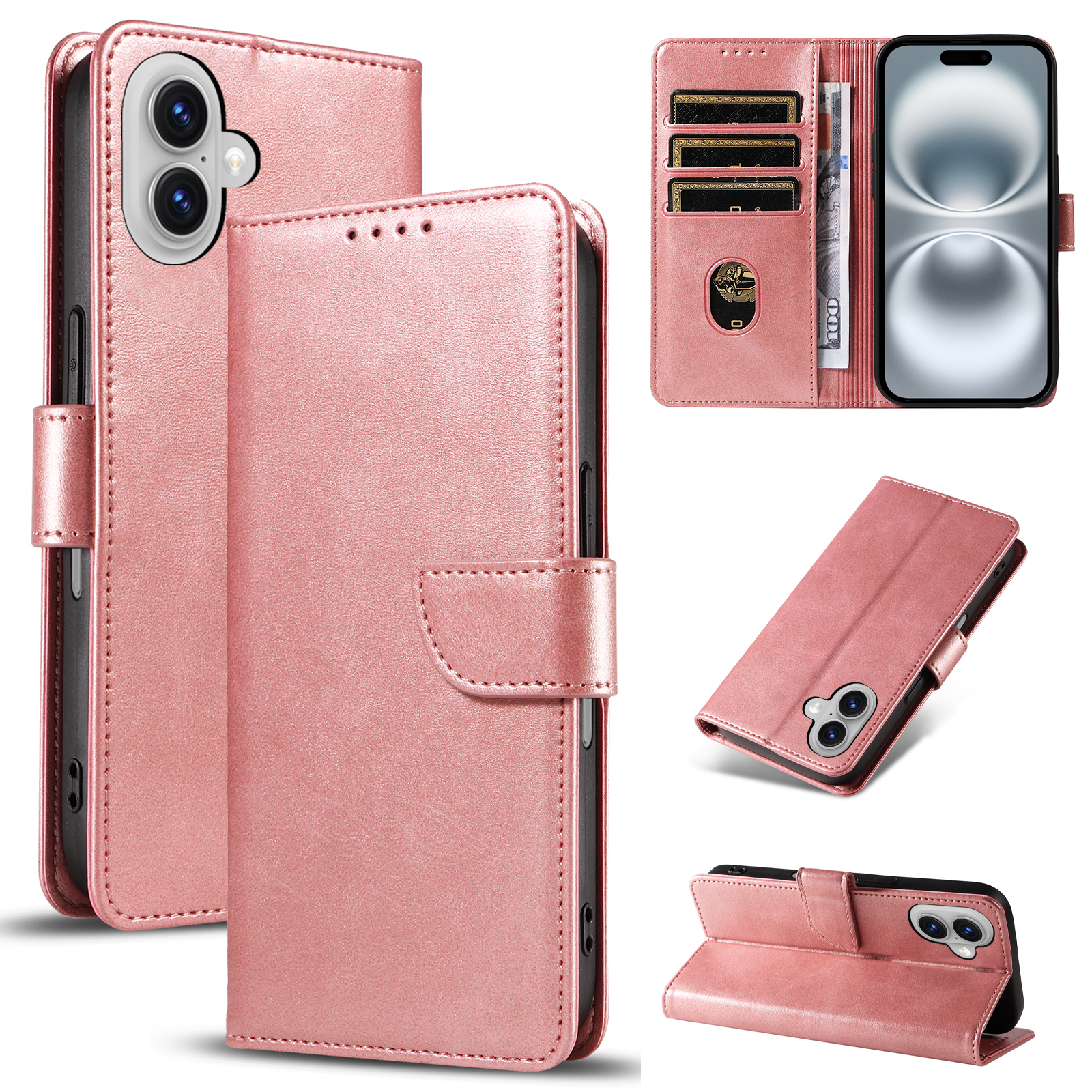 For iPhone 16 Case with 2Pcs Tempered Glass WANLONFENG WN Series Calf Texture Leather Phone Cover Big Cutouts – Pink