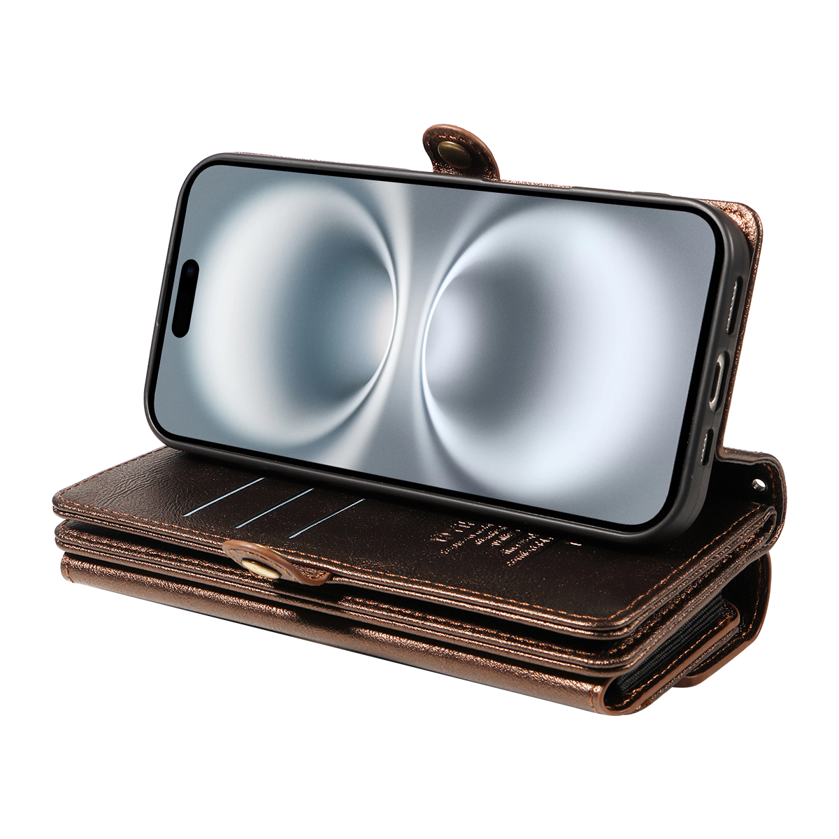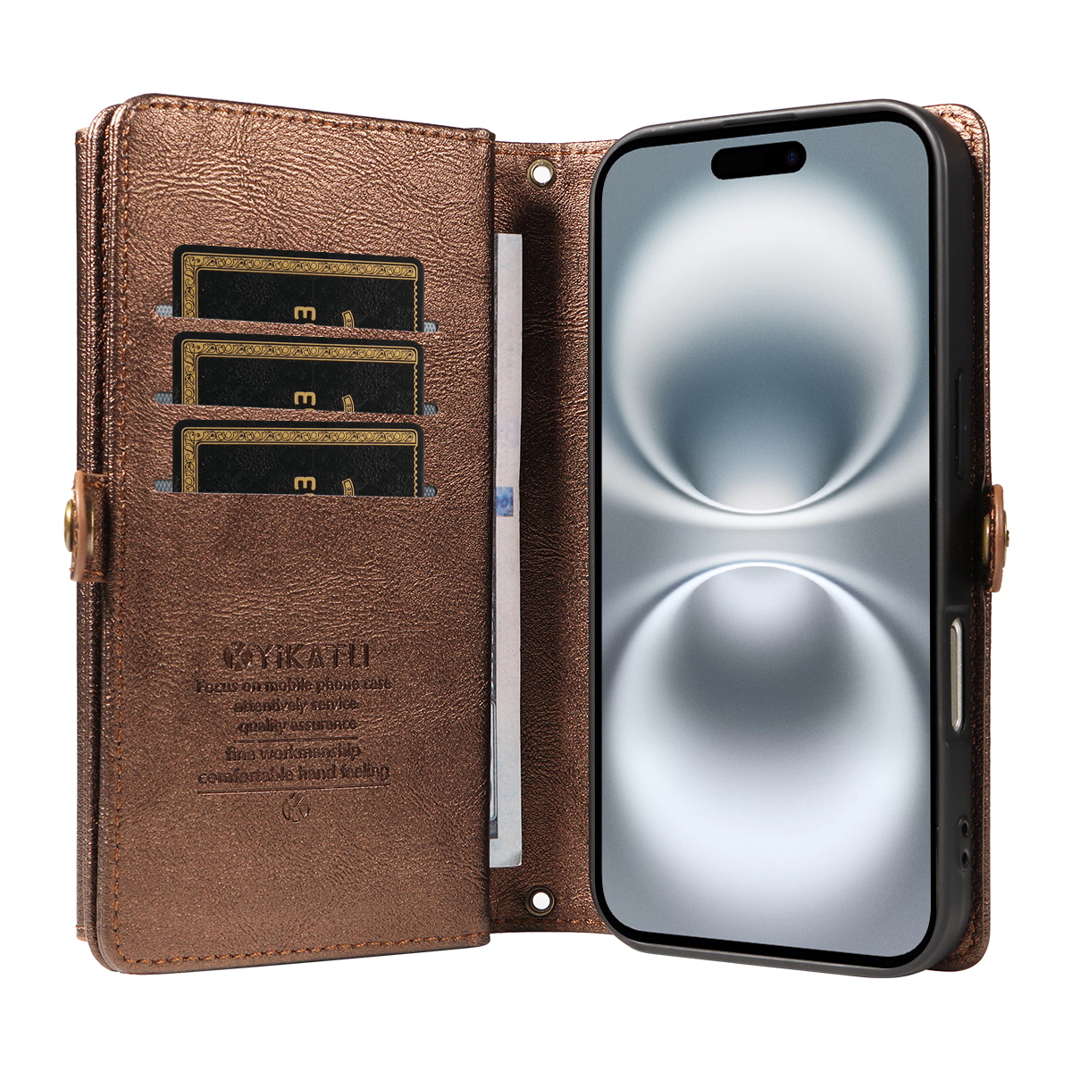 For iPhone 16 Case YIKATU YK-008 Zipper Wallet Leather Phone Cover with Shoulder Strap - Brown $27.69