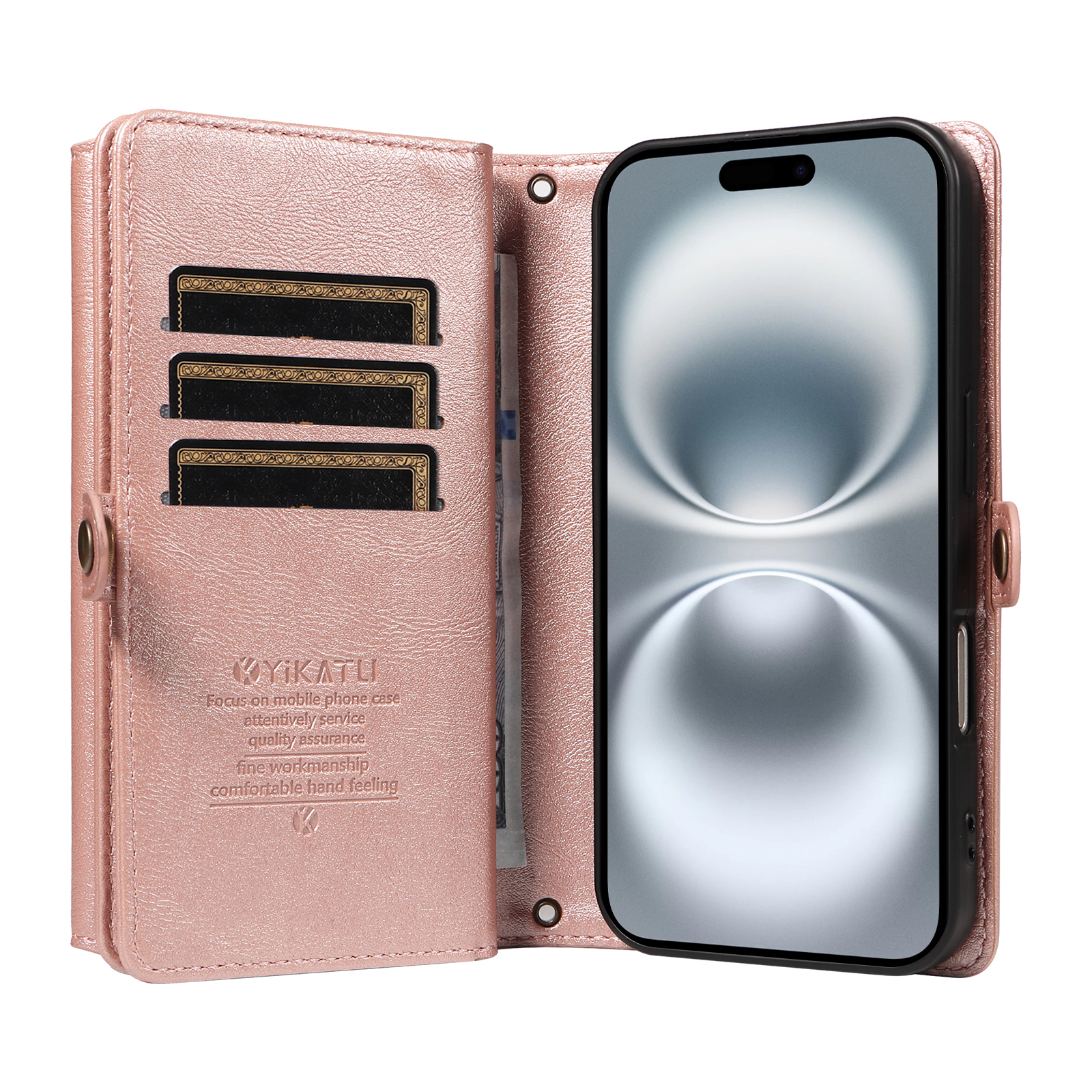 For iPhone 16 Case YIKATU YK-008 Zipper Wallet Leather Phone Cover with Shoulder Strap - Rose Gold $27.77