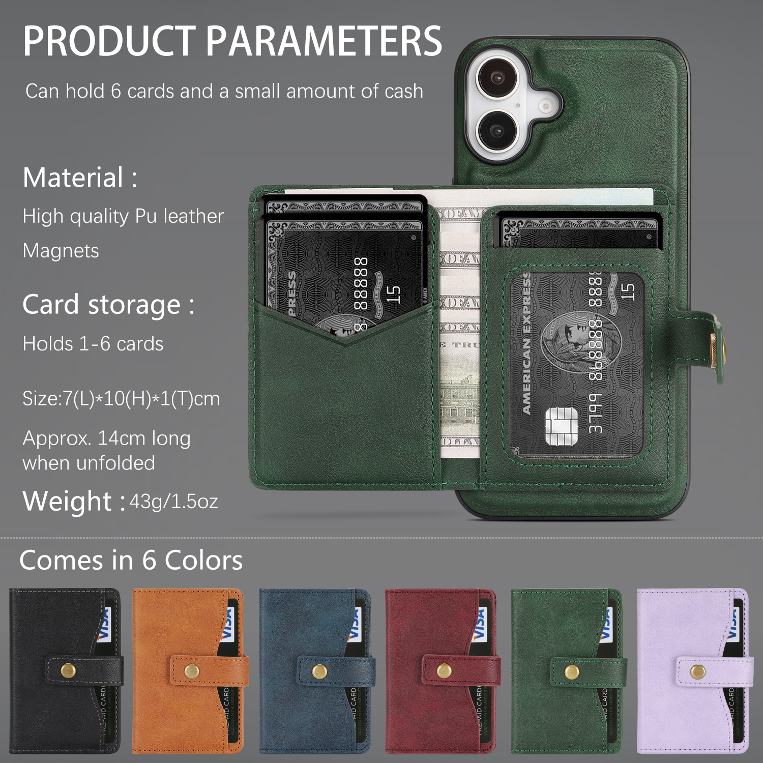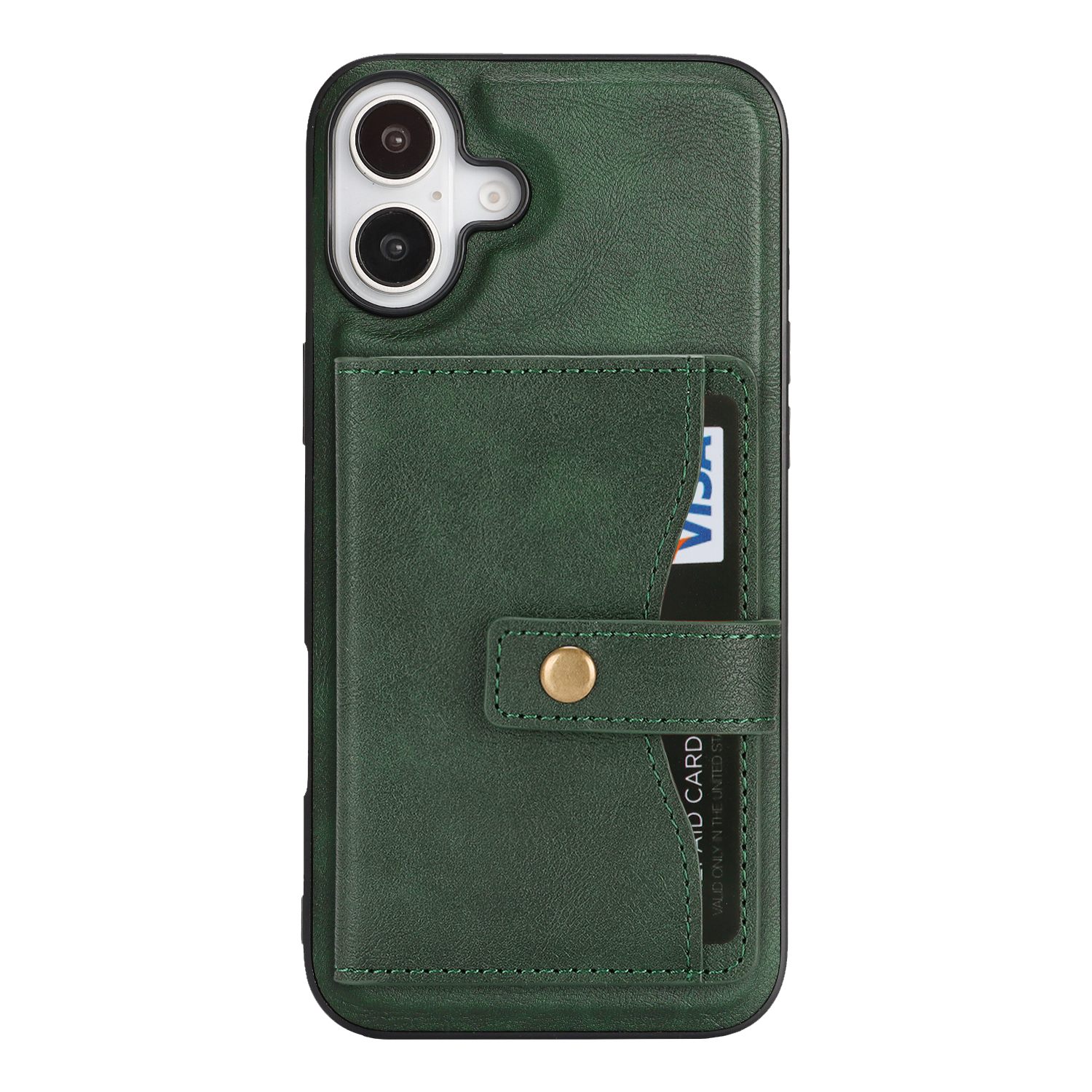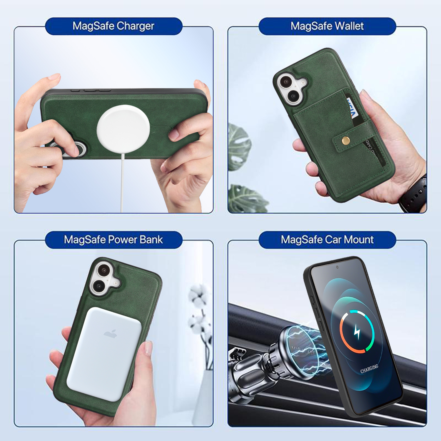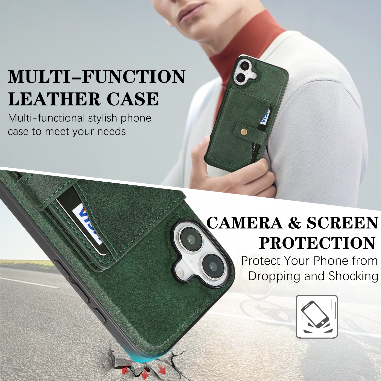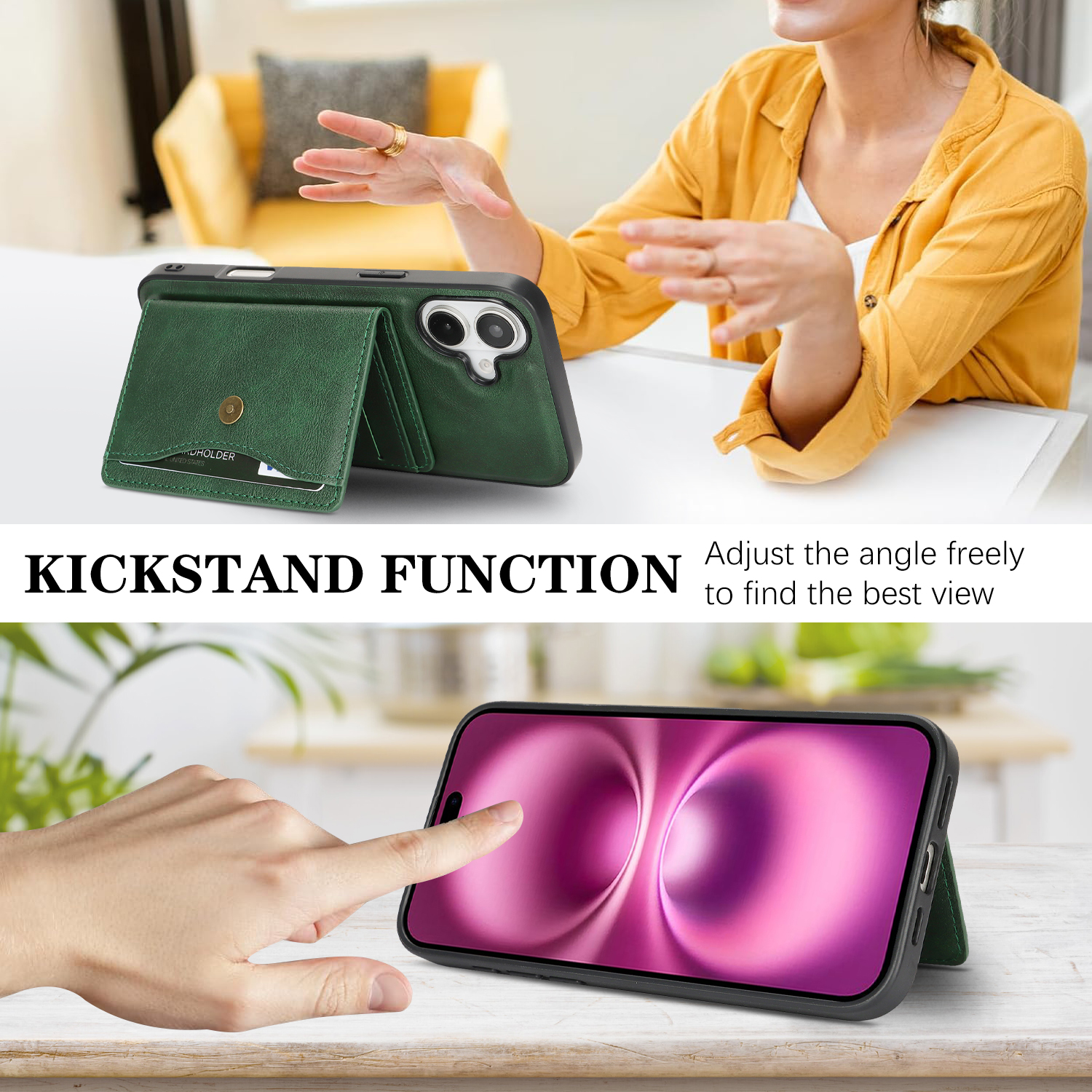 For iPhone 16 Kickstand Case Detachable Card Bag Compatible with MagSafe PU Leather Coated TPU Phone Cover – Green