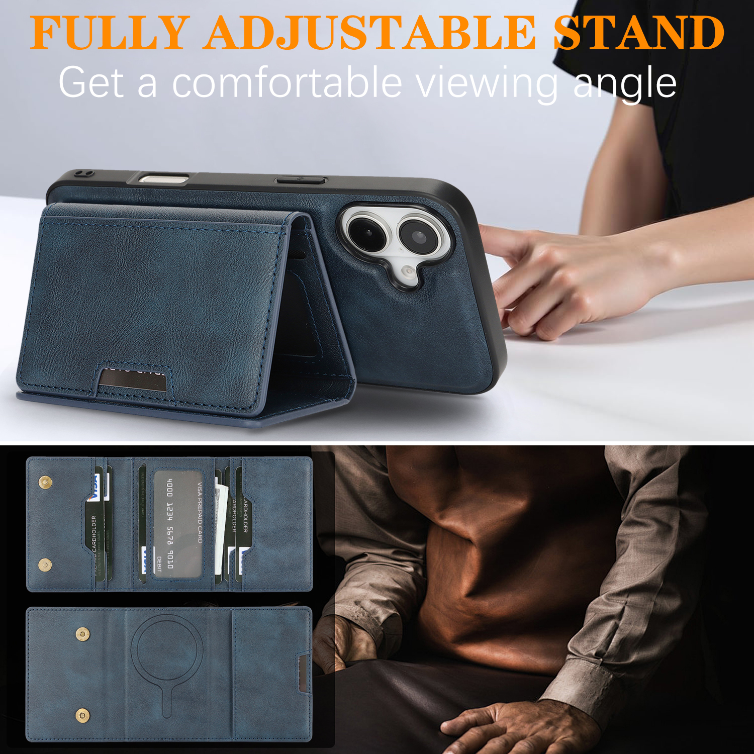 - MagSafe Compatible Supports for MagSafe accessories and wireless charging, featuring a minimalist magnetic leather bi-fold design with card holder functionality.