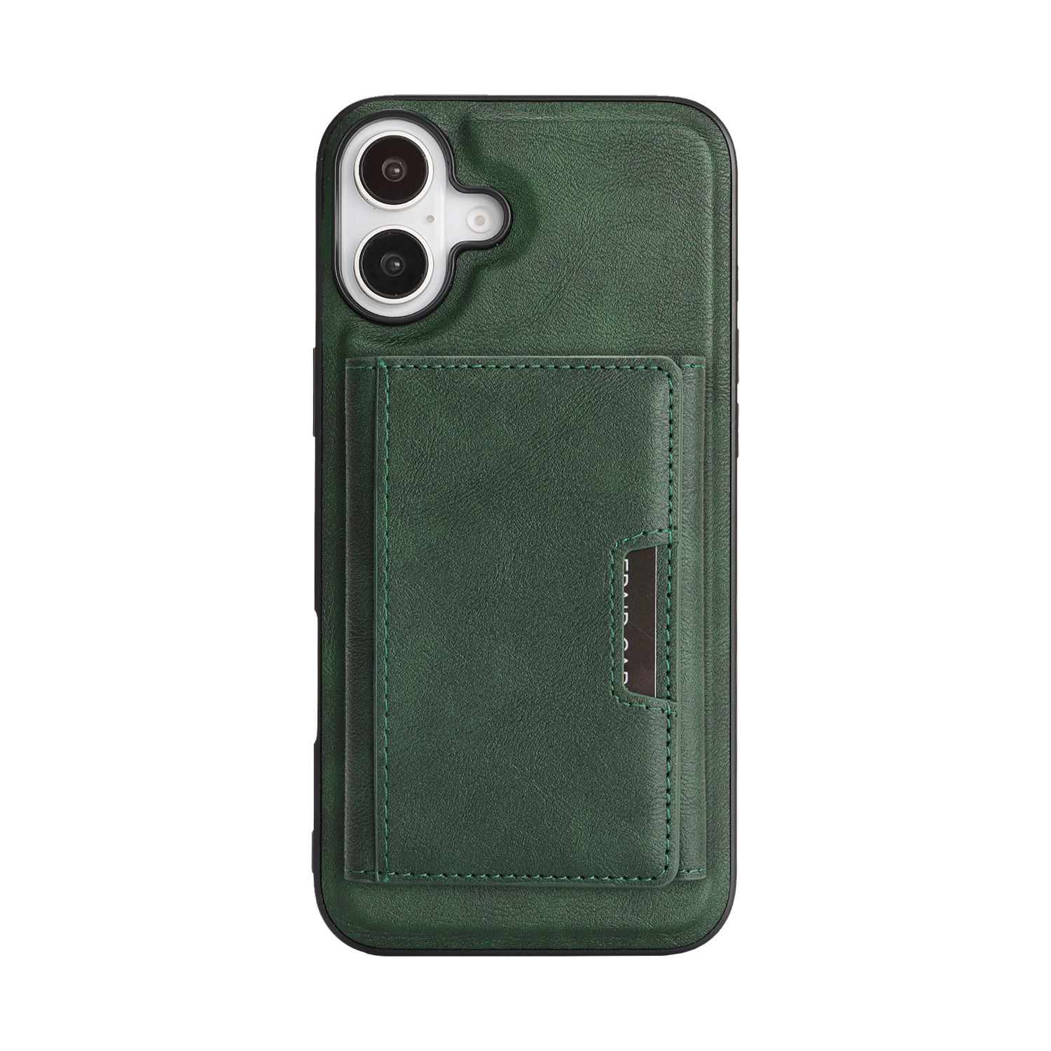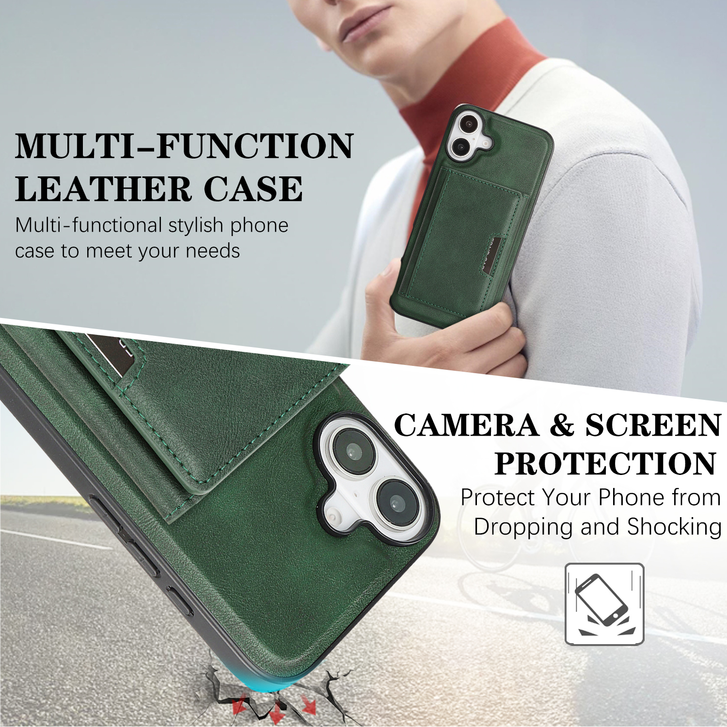For iPhone 16 Kickstand Case Tri-fold Card Bag PU Leather Coated TPU Cover Compatible with MagSafe – Green