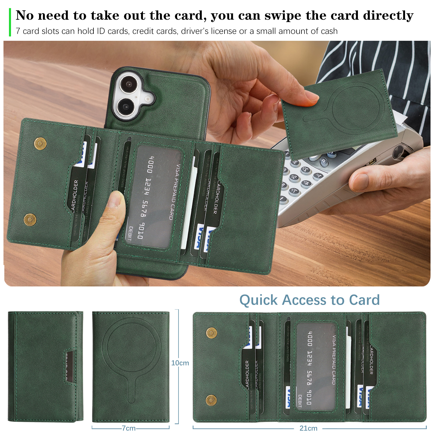 For iPhone 16 Kickstand Case Tri-fold Card Bag PU Leather Coated TPU Cover Compatible with MagSafe - Green $21.15