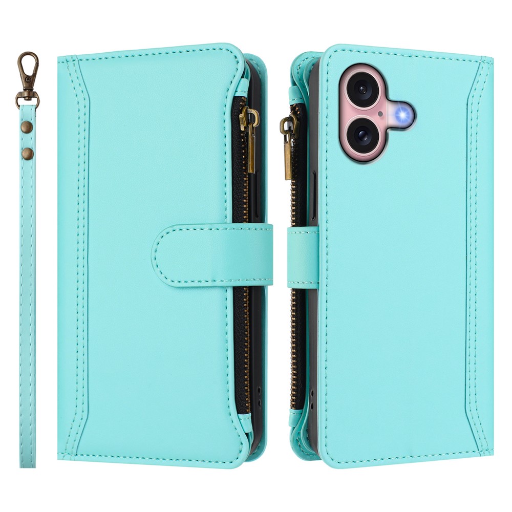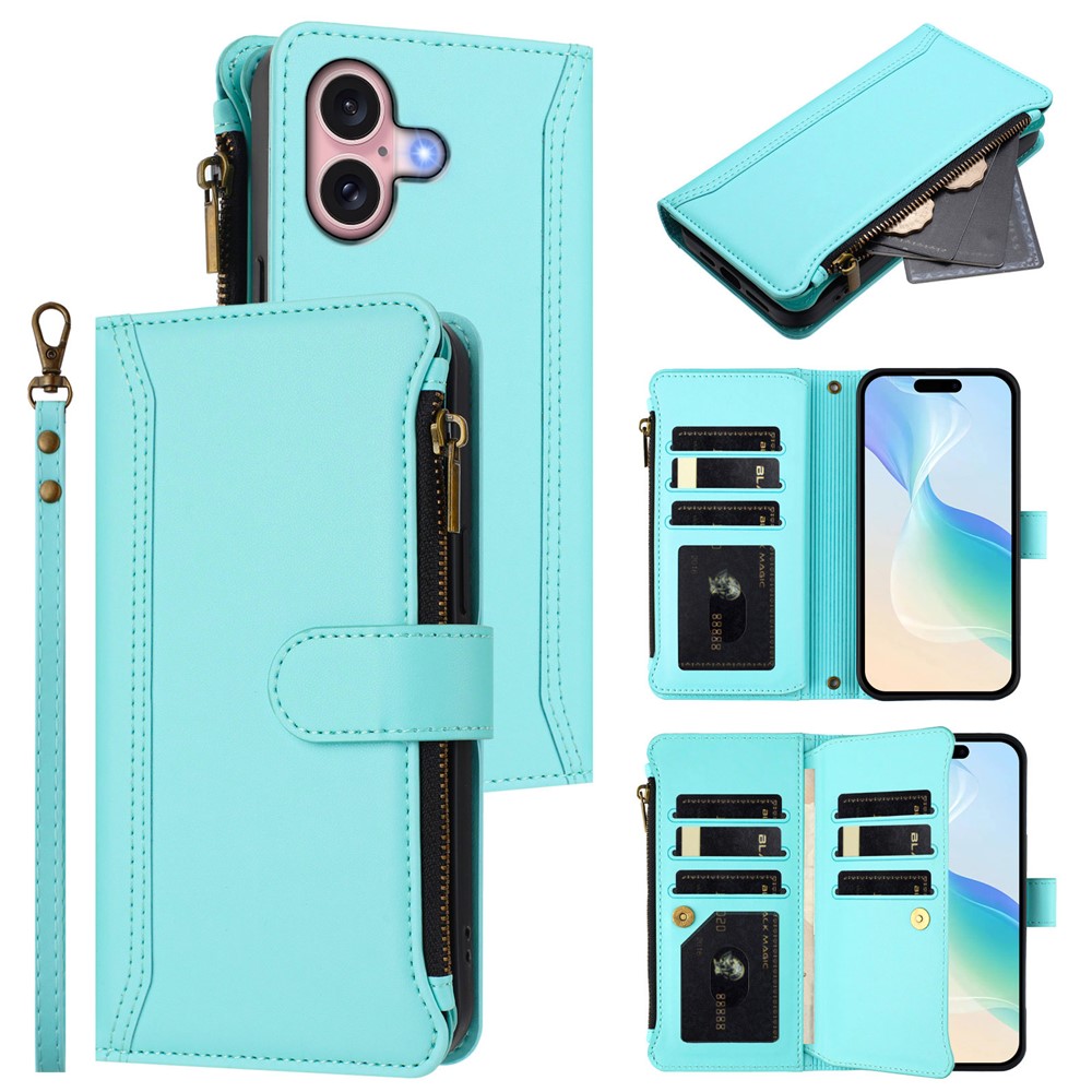 For iPhone 16 Leather Case 9 Card Slots Zipper Wallet Stand Phone Cover with Wrist Strap - Mint Green