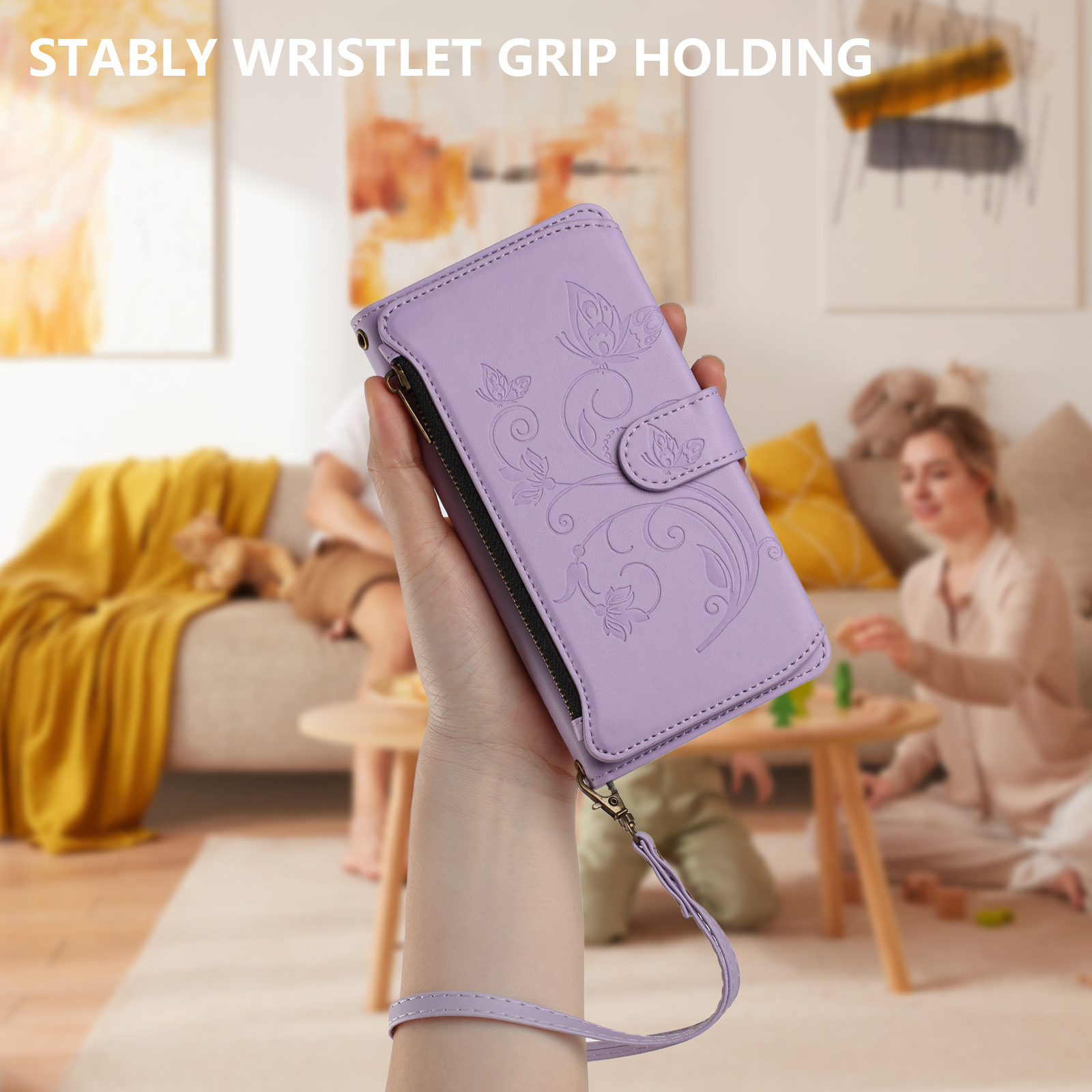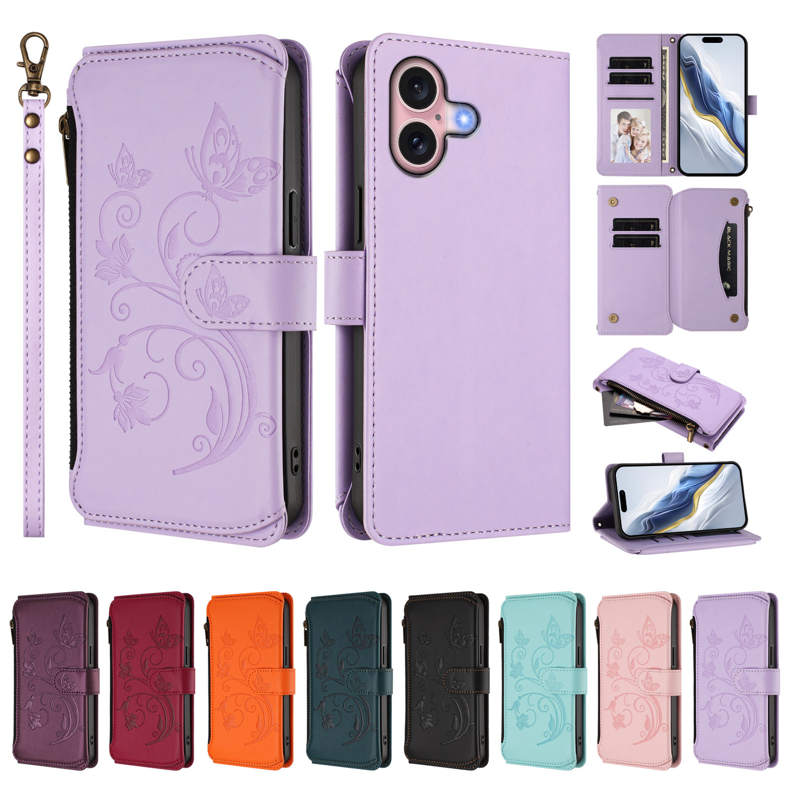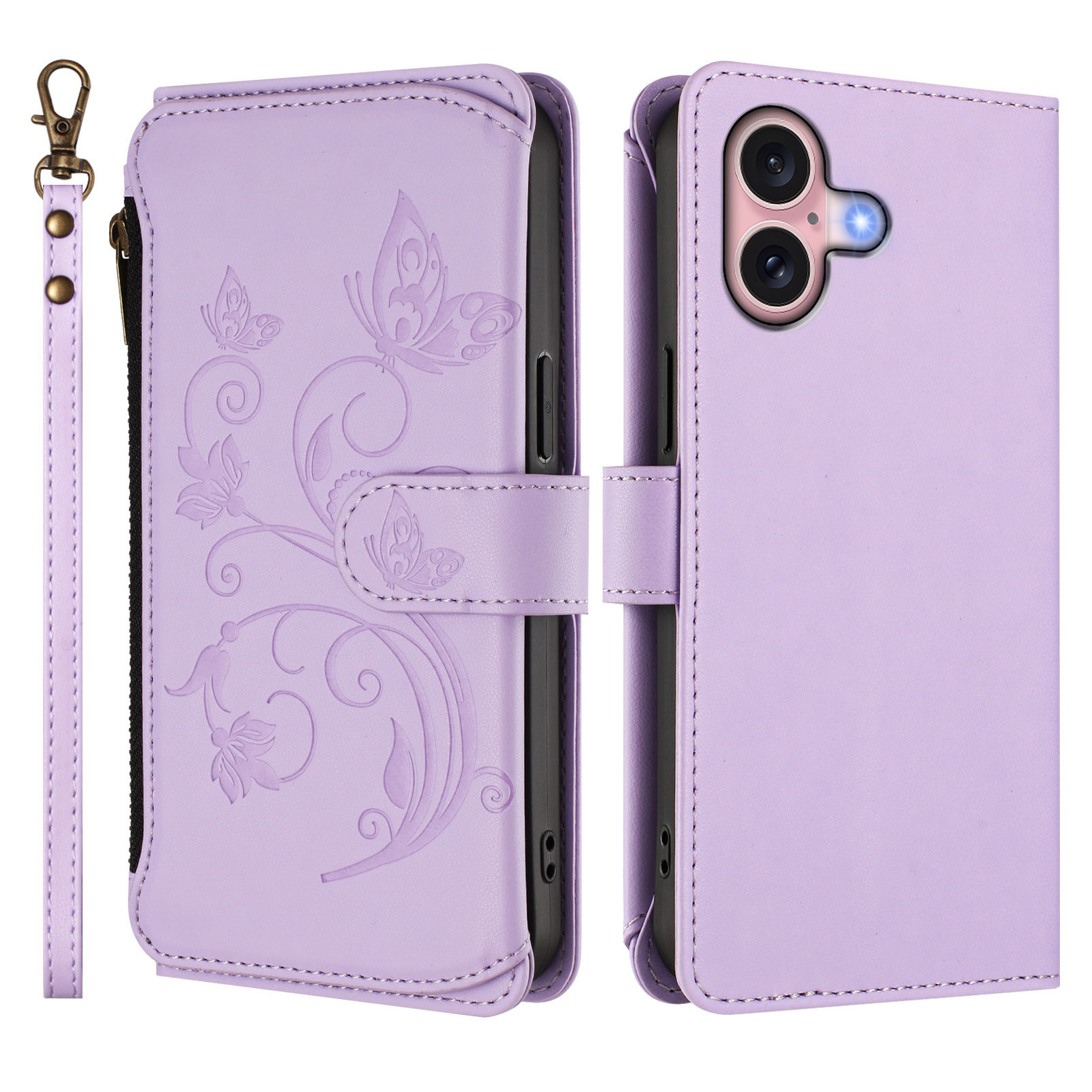 • For iPhone 16 Leather Case Butterfly Floral Imprint Zipper Wallet Stand Cover with Wrist Strap - Purple