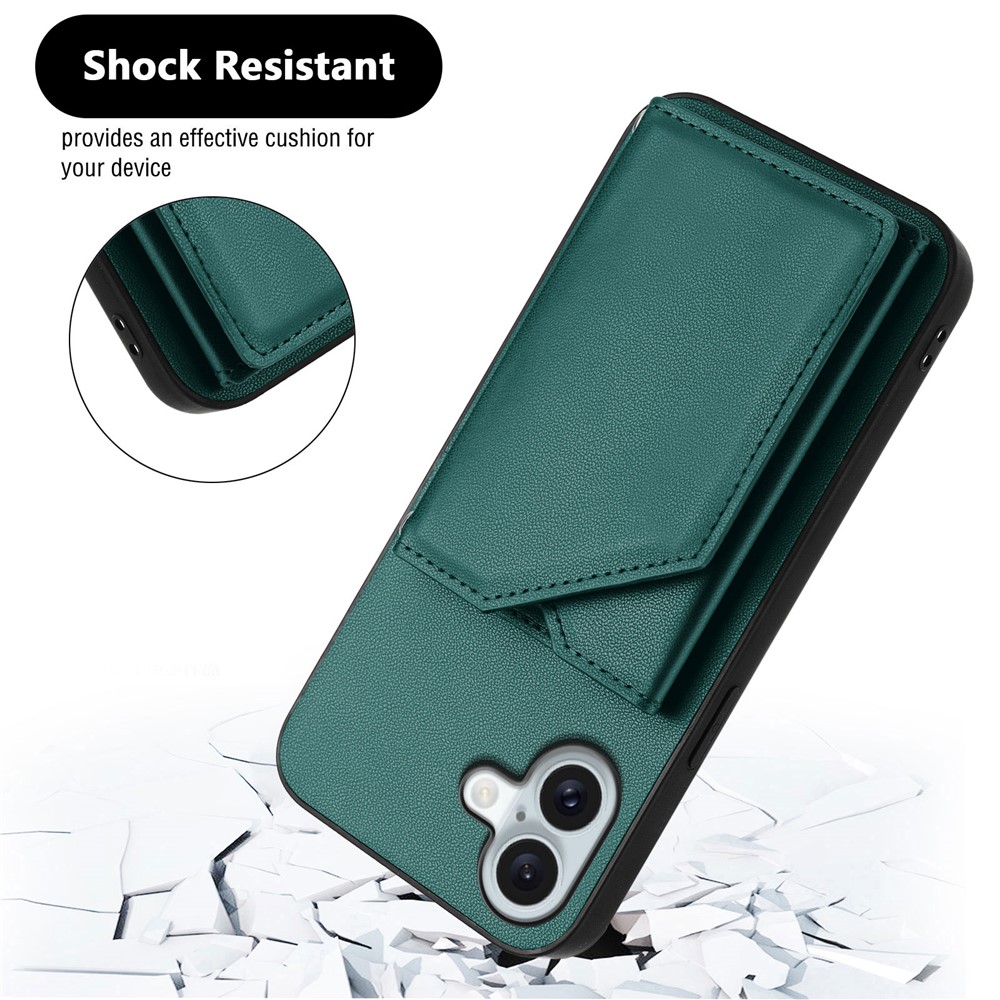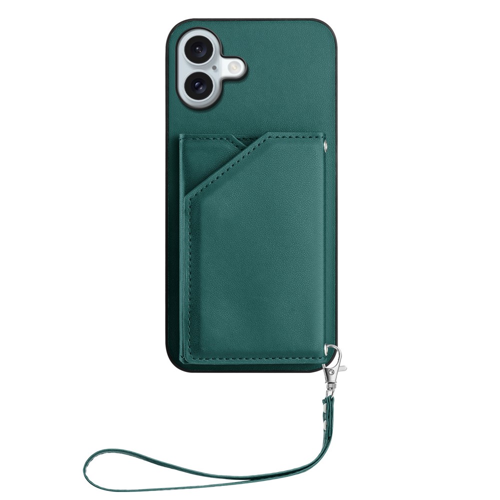 For iPhone 16 Plus Case Card Holder Kickstand Skin-Touch Phone Cover with Wrist Strap - Green