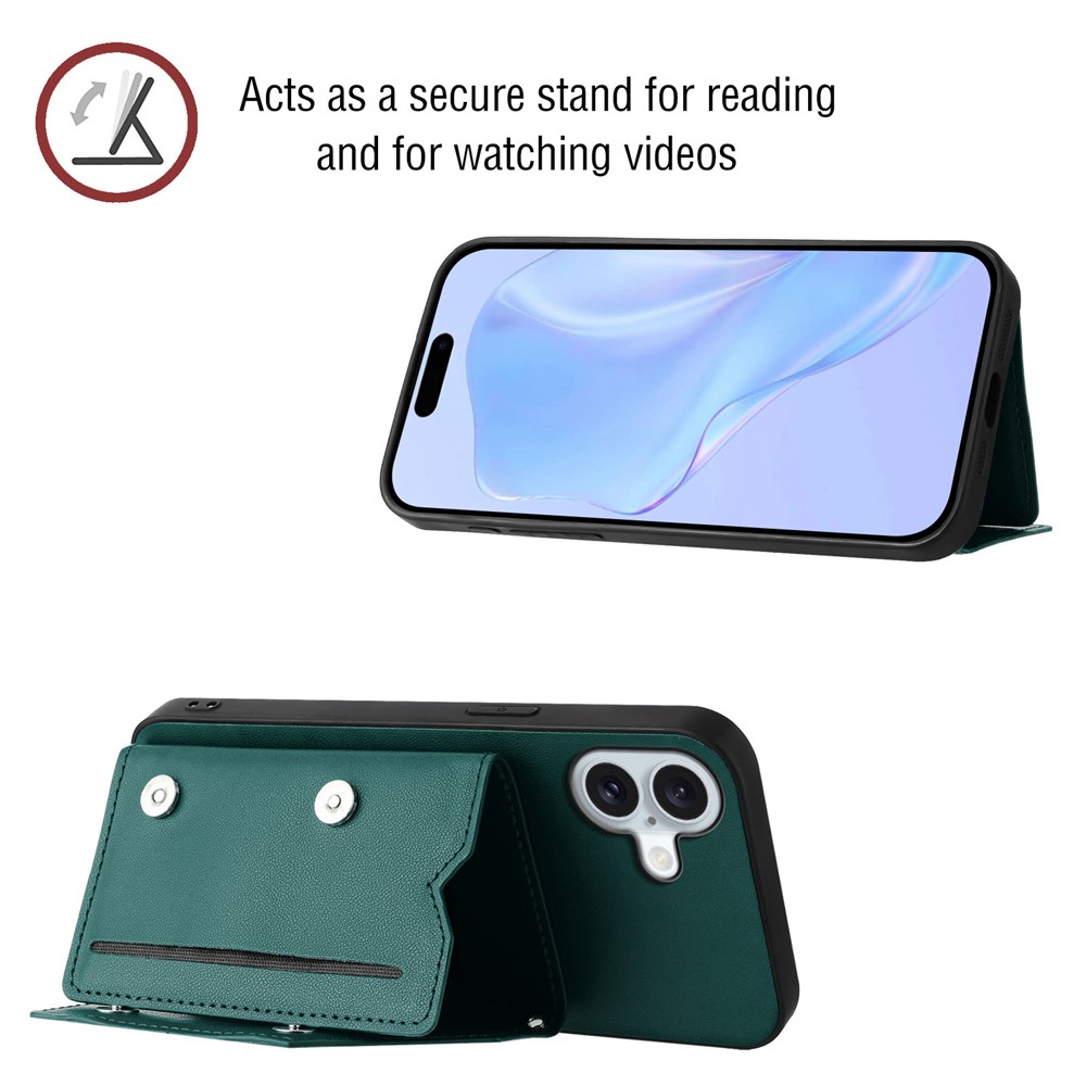 For iPhone 16 Plus Case Card Holder Kickstand Skin-Touch Phone Cover with Wrist Strap - Green $15.58