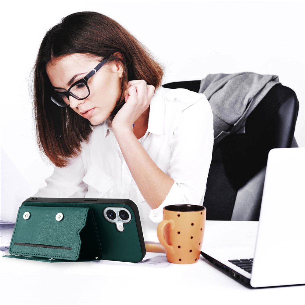 For iPhone 16 Plus Case Card Holder Kickstand Skin-Touch Phone Cover with Wrist Strap – Green