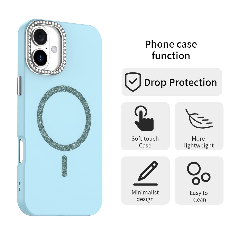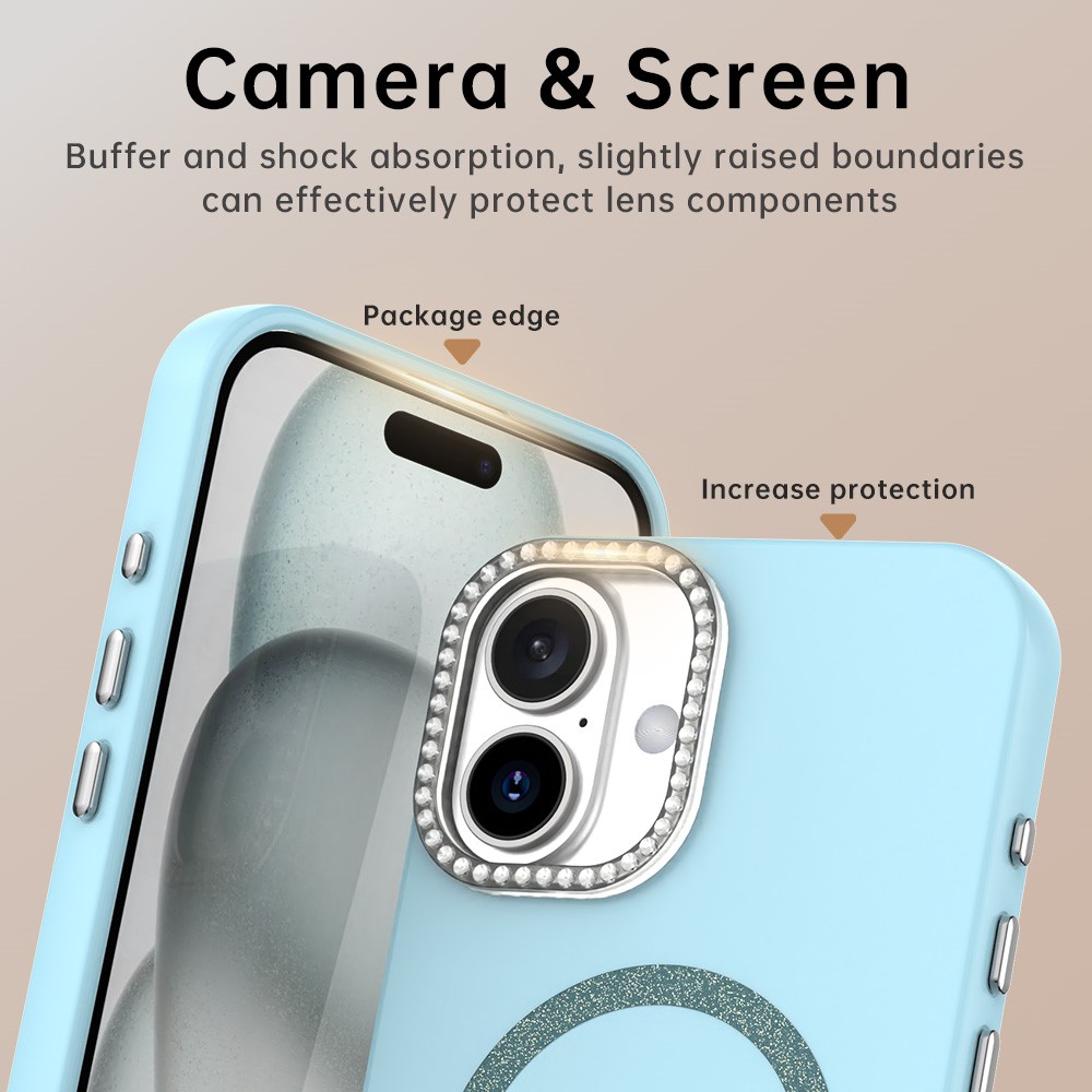For iPhone 16 Plus Case Compatible with MagSafe TPU + PET Phone Cover with Rhinestone Decor Lens Frame - Blue $13.14