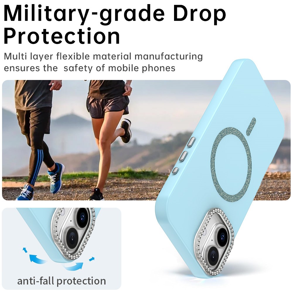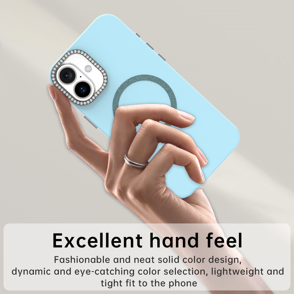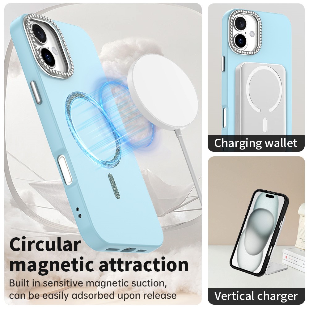 For iPhone 16 Plus Case Compatible with MagSafe TPU + PET Phone Cover with Rhinestone Decor Lens Frame – Blue