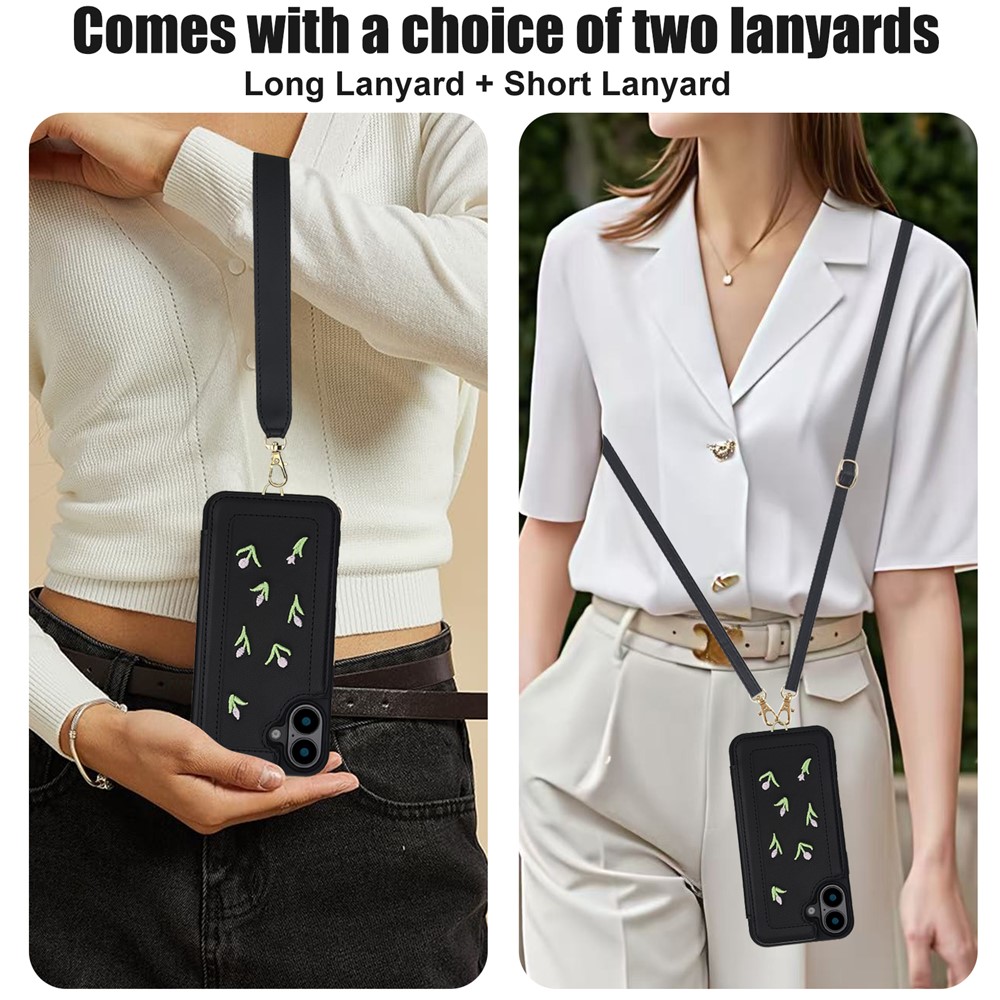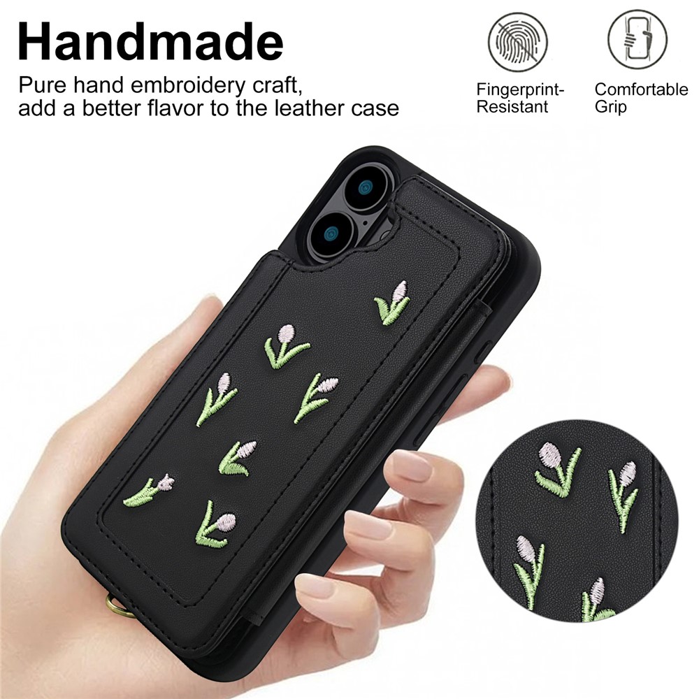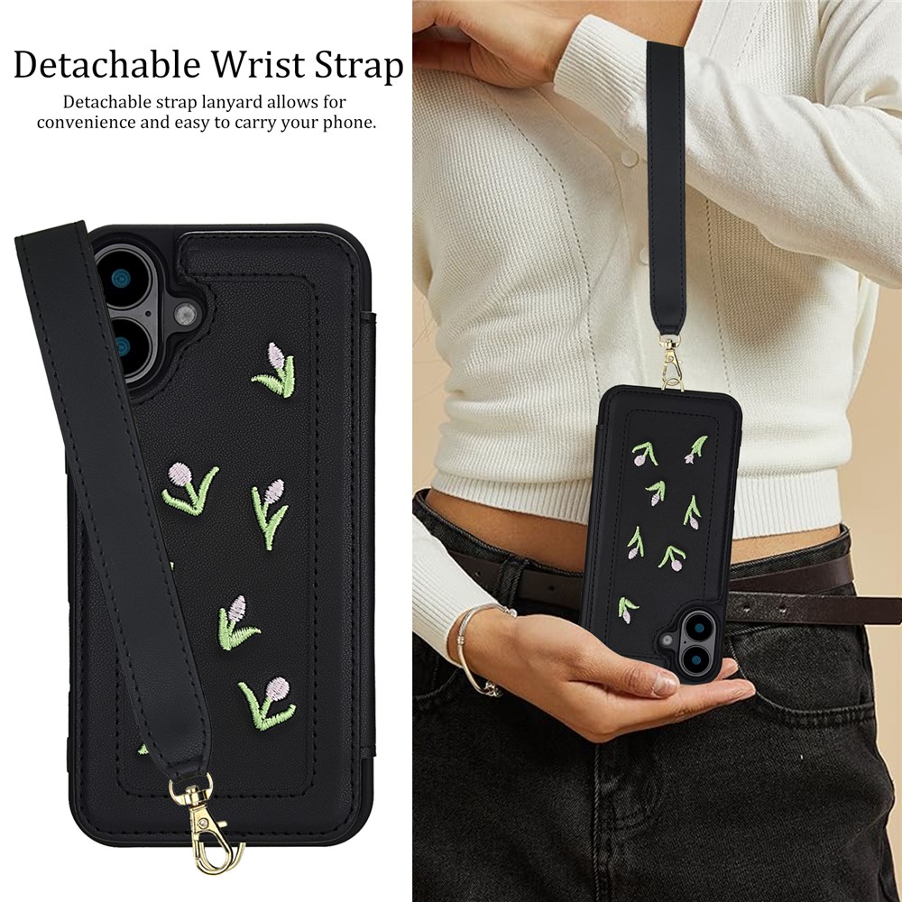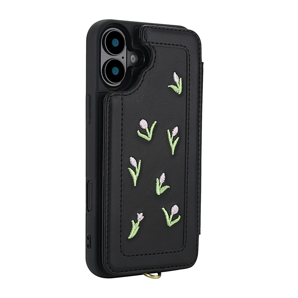 For iPhone 16 Plus Case Embroidered Tulips PU Leather Card Holder Back Cover with Shoulder Strap / Wrist Strap – Black