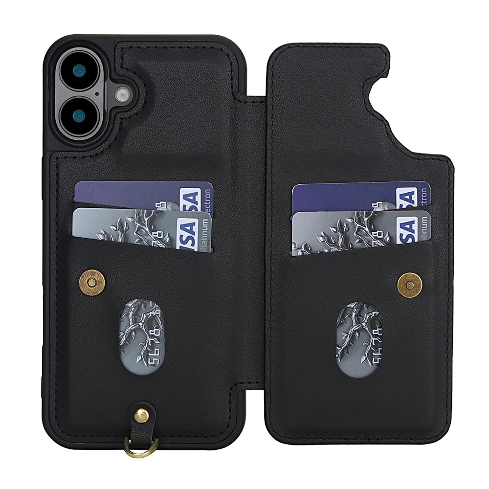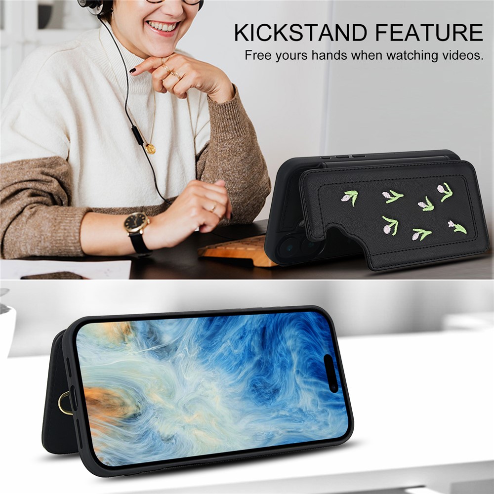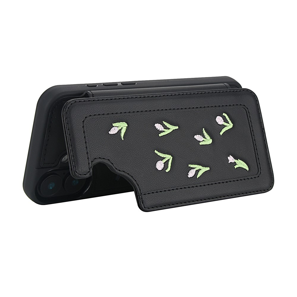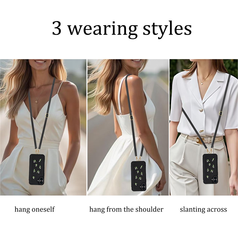 For iPhone 16 Plus Case Embroidered Tulips PU Leather Card Holder Back Cover with Shoulder Strap / Wrist Strap – Black