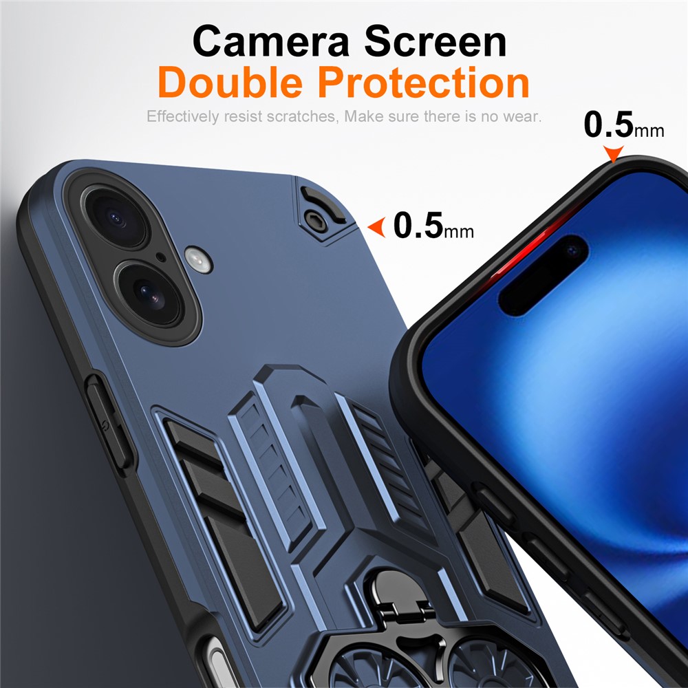 For iPhone 16 Plus Case Ring Holder Kickstand PC + TPU Shockproof Phone Cover – Navy Blue