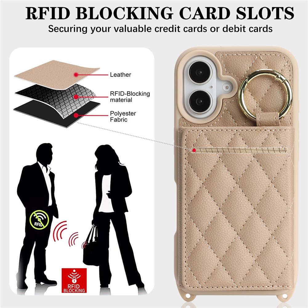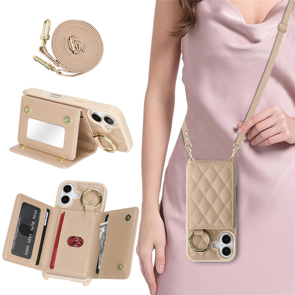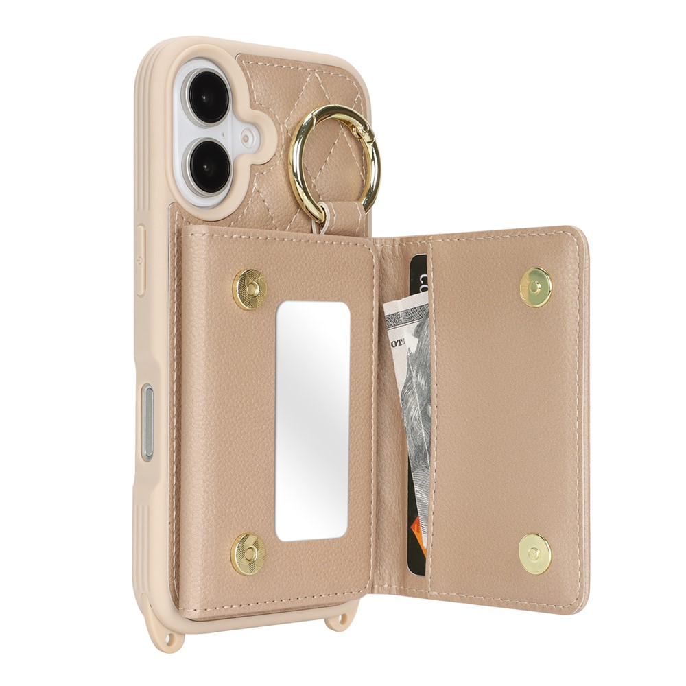 For iPhone 16 Plus Case with Lanyard / Mirror / Card Holder Grids Pattern RFID Blocking Phone Cover – Beige