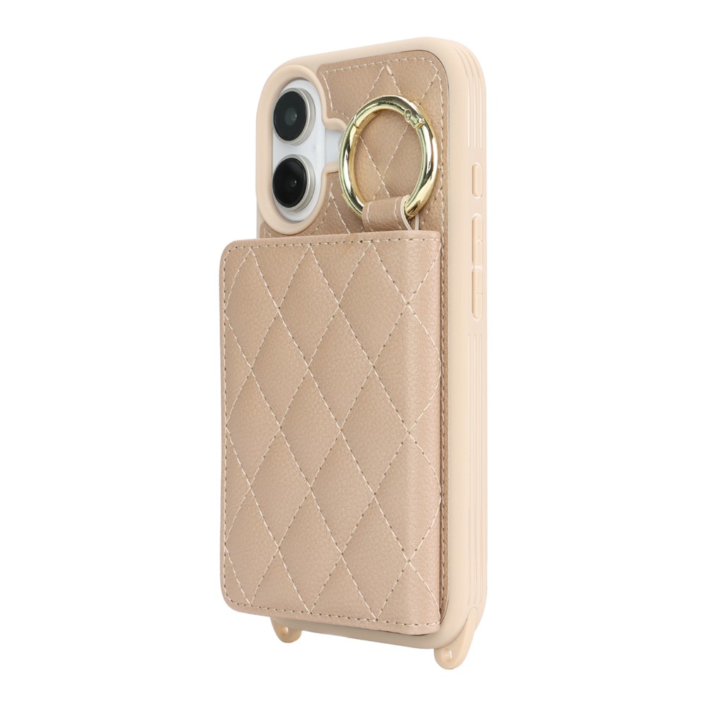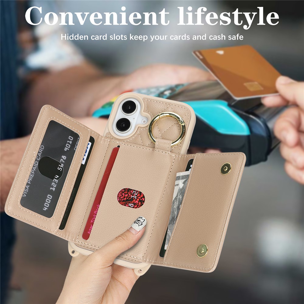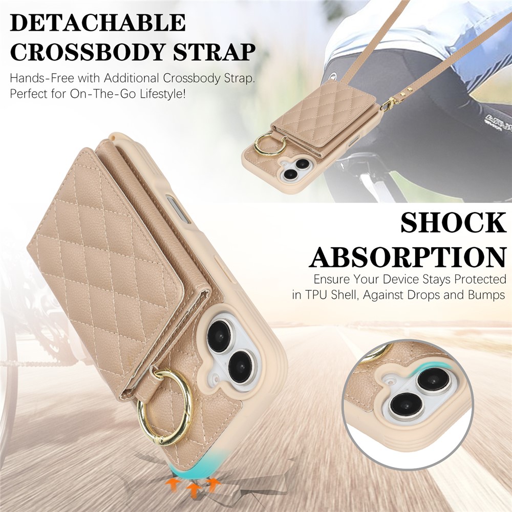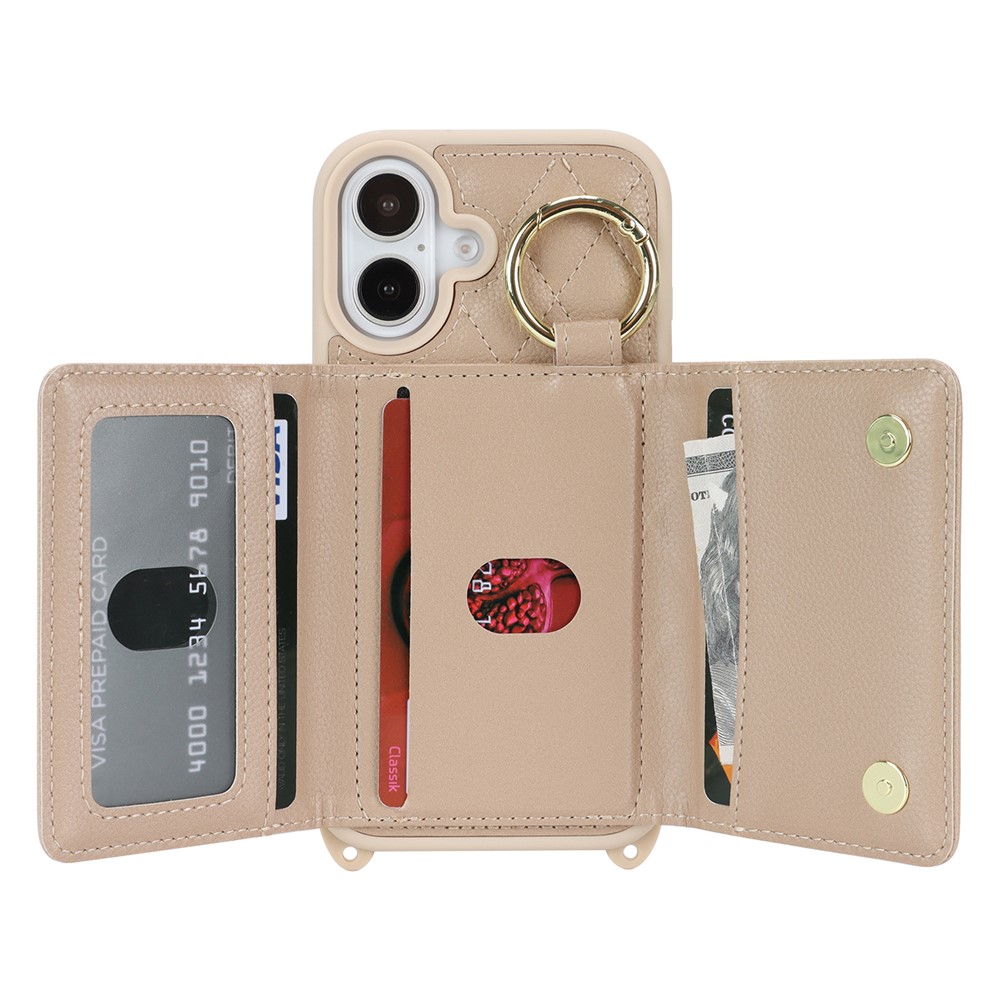 For iPhone 16 Plus Case with Lanyard / Mirror / Card Holder Grids Pattern RFID Blocking Phone Cover – Beige