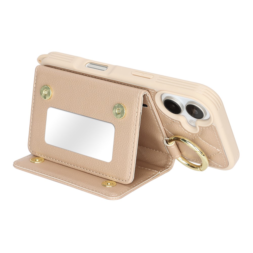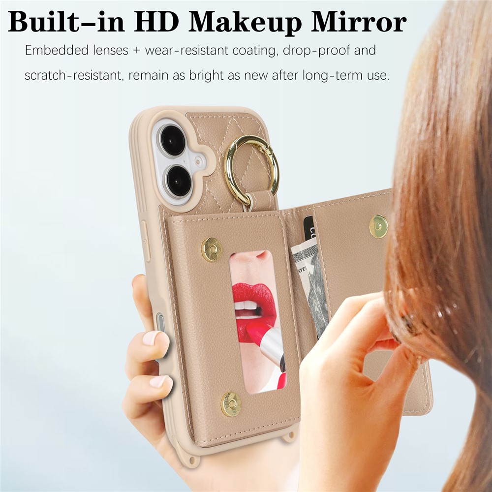 For iPhone 16 Plus Case with Lanyard  /  Mirror  /  Card Holder Grids Pattern RFID Blocking Phone Cover - Beige