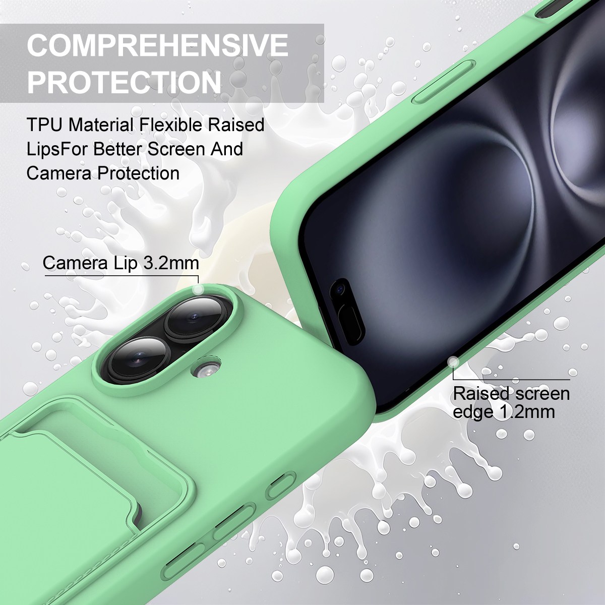 For iPhone 16 Plus Liquid Silicone Case Phone Back Cover with Card Holder and Short Strap – Green