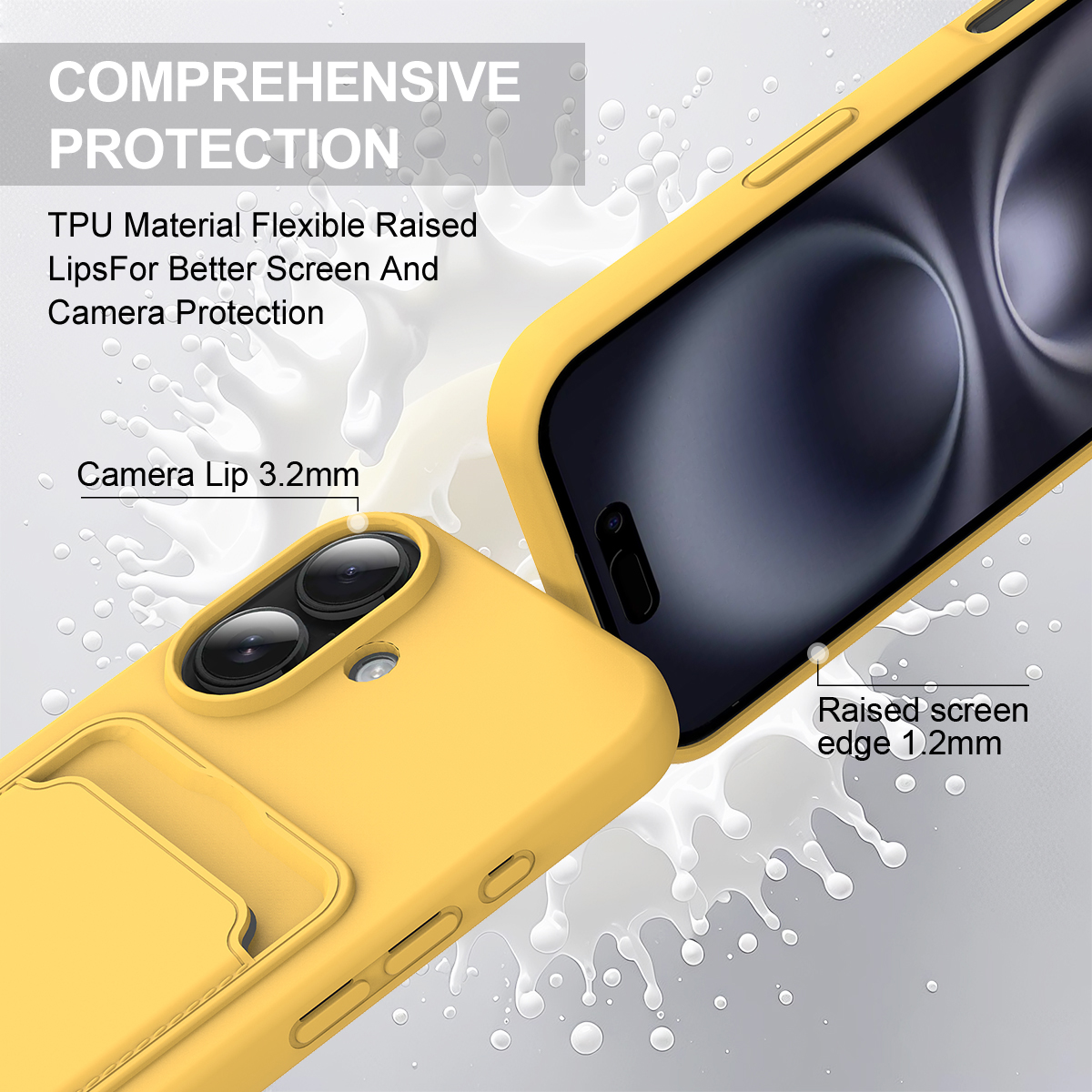 For iPhone 16 Plus Liquid Silicone Case Phone Back Cover with Card Holder and Short Strap – Yellow