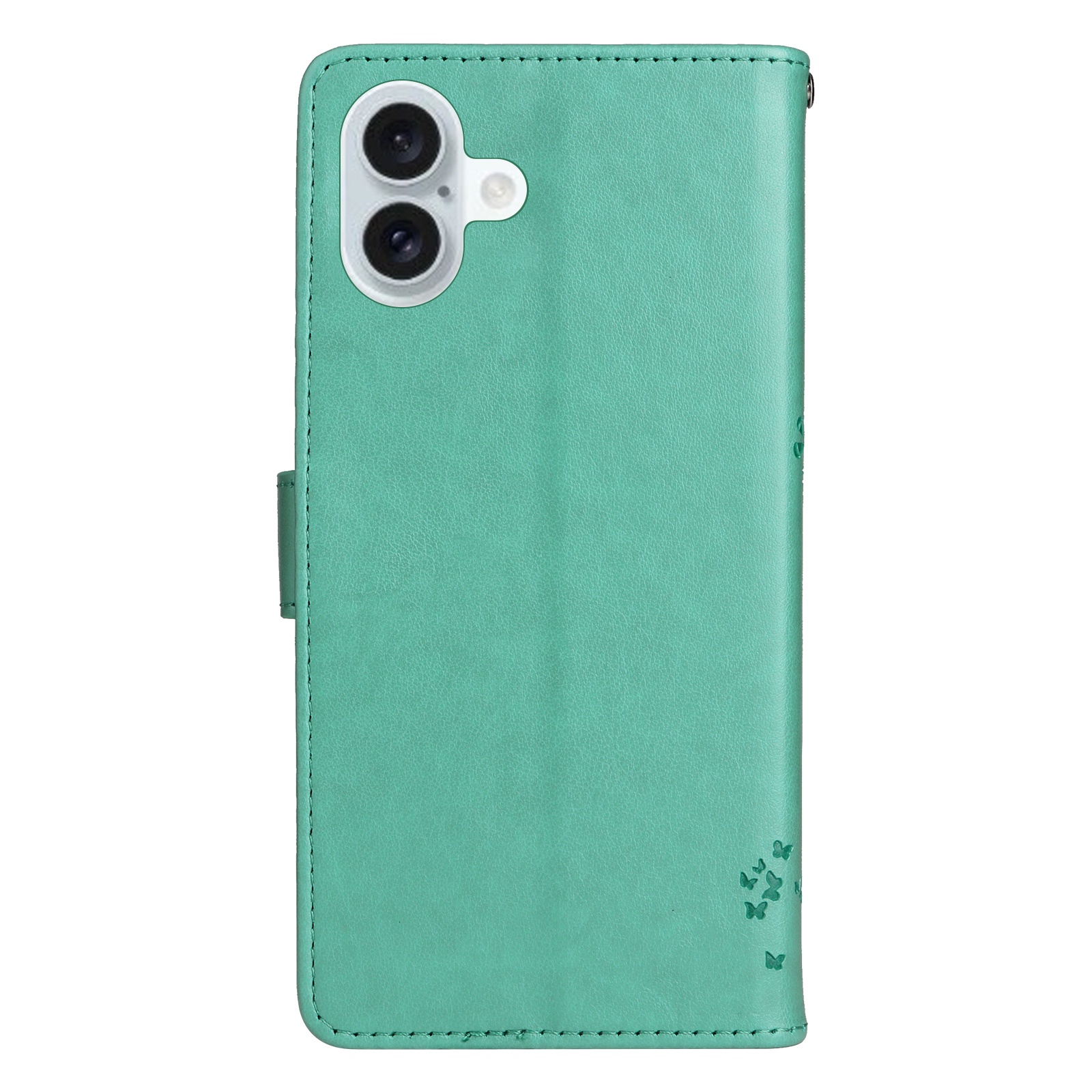 For iPhone 16 Plus Phone Case with Stand Cat Tree Pattern Leather Wallet Mobile Cover - Green