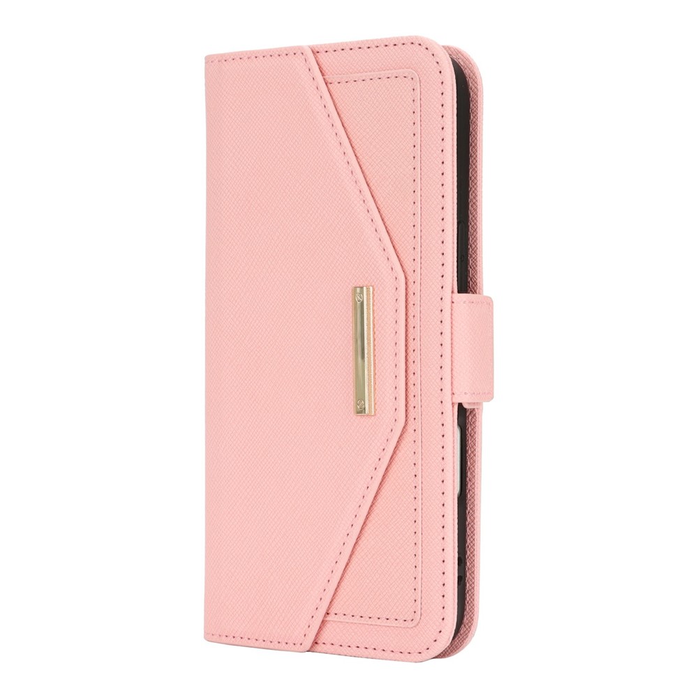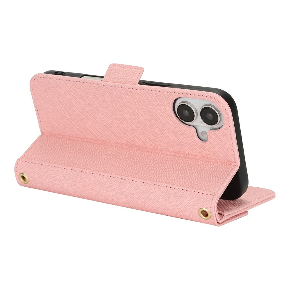 For iPhone 16 Plus Stand Case Cross Texture PU Leather Wallet Phone Cover with Shoulder Strap / Makeup Mirror – Pink