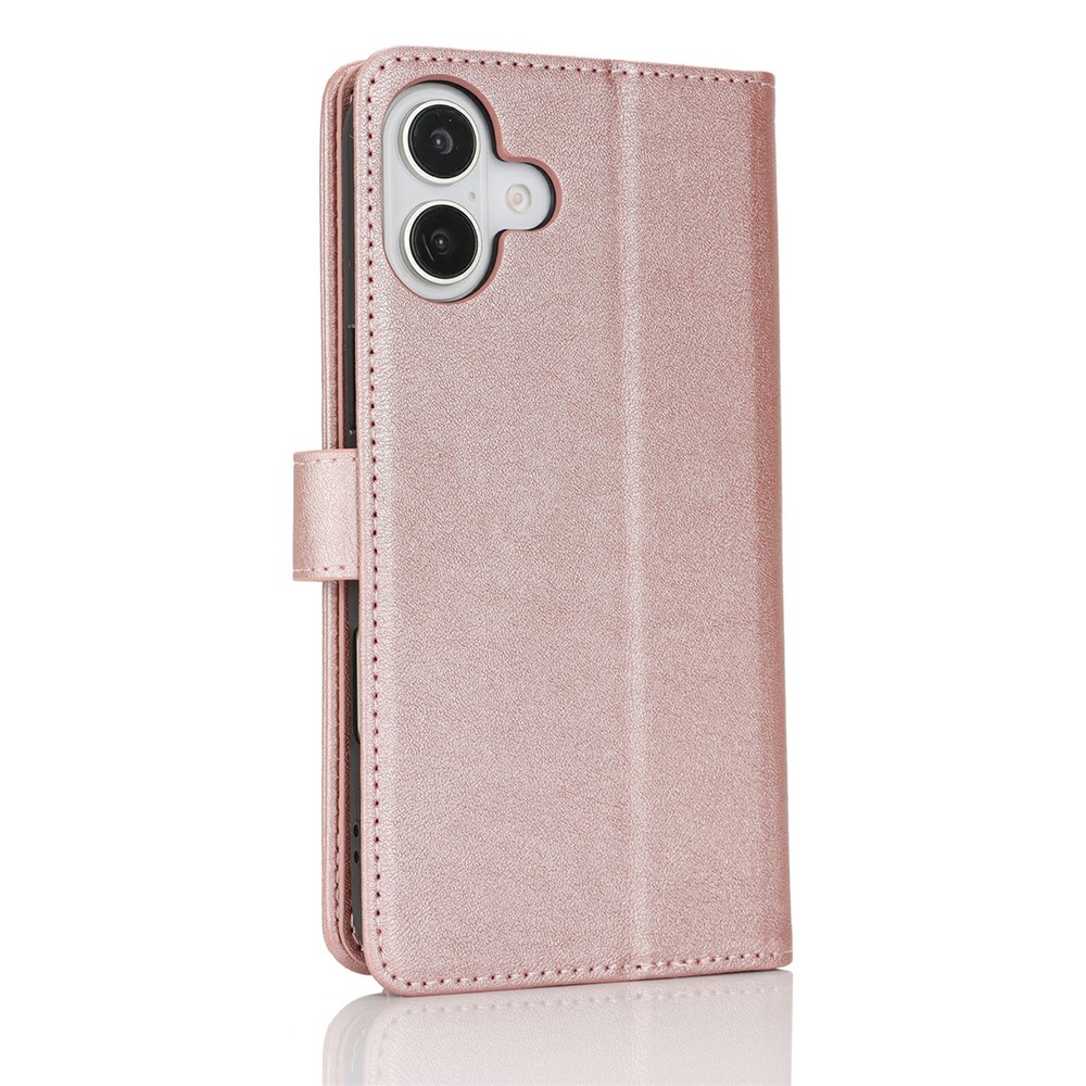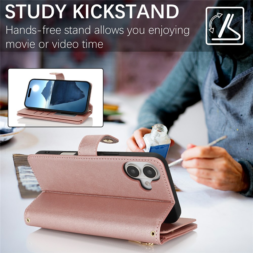 For iPhone 16 Plus Stand Case PU Leather Phone Cover with Straps / Zipper Wallet / Multiple Card Slots – Rose Gold