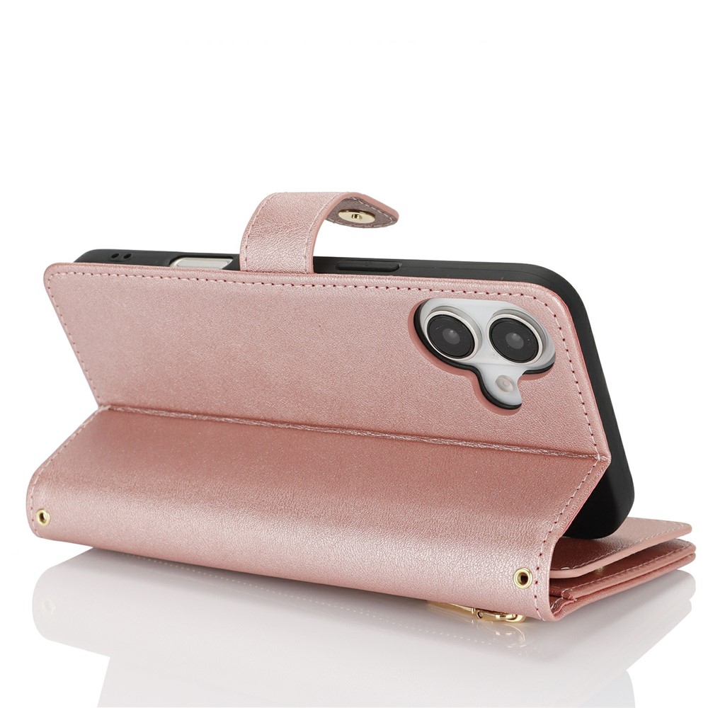 For iPhone 16 Plus Stand Case PU Leather Phone Cover with Straps  /  Zipper Wallet  /  Multiple Card Slots - Rose Gold