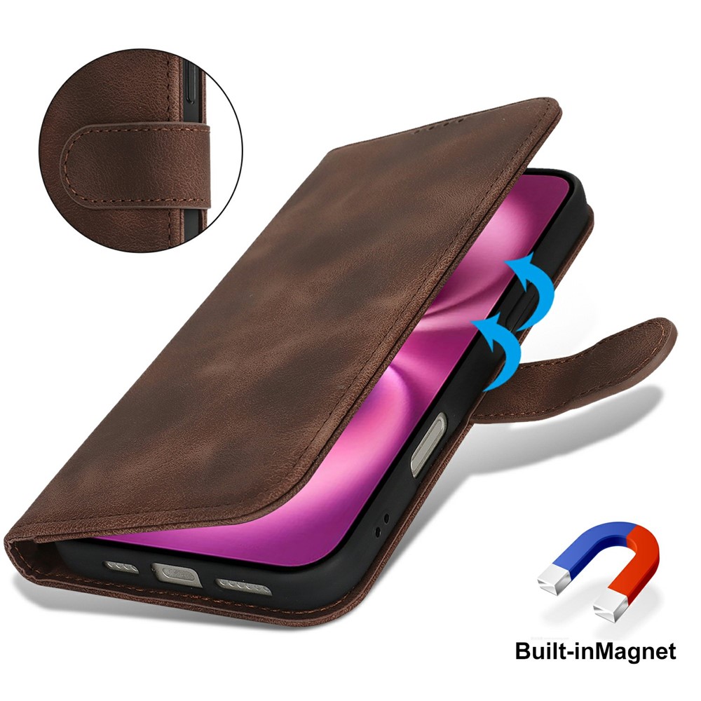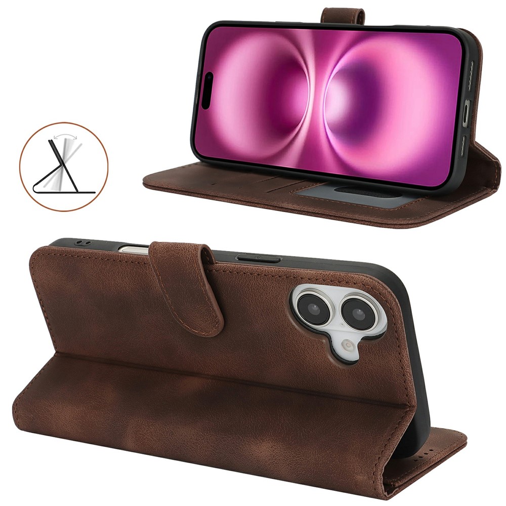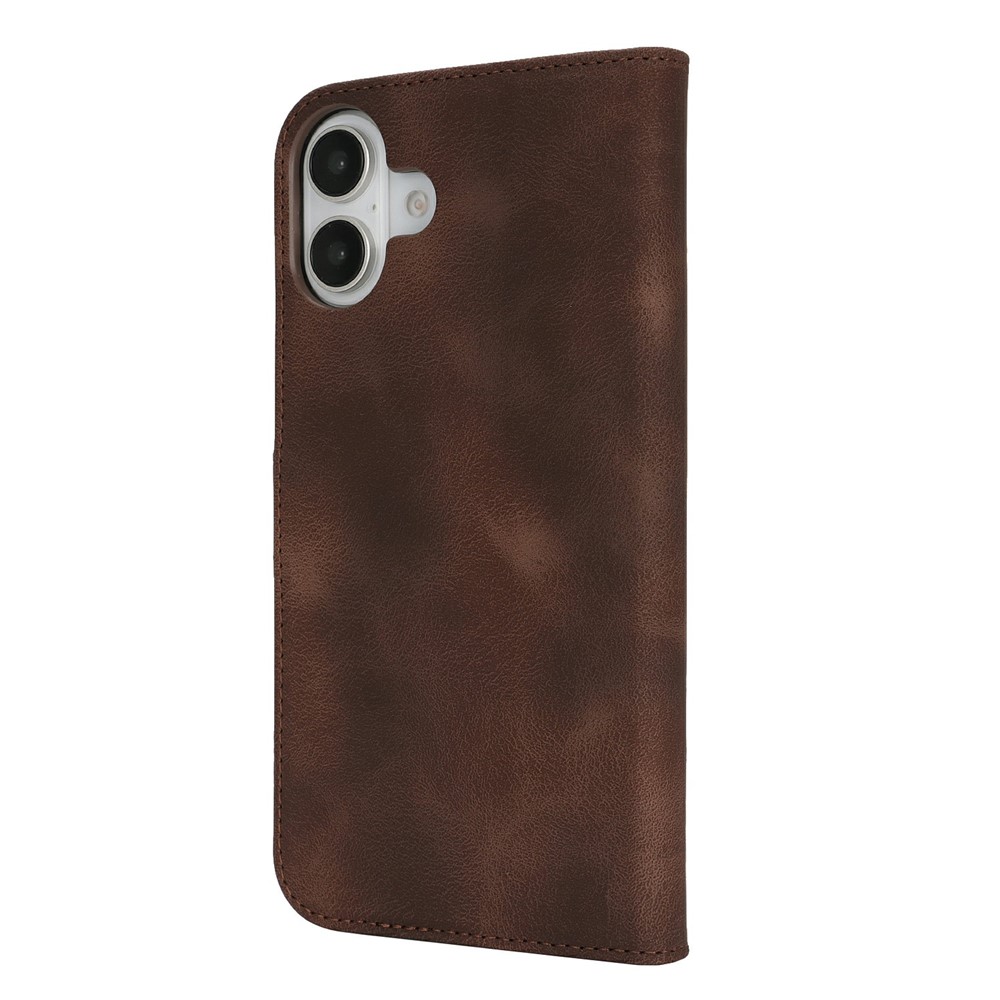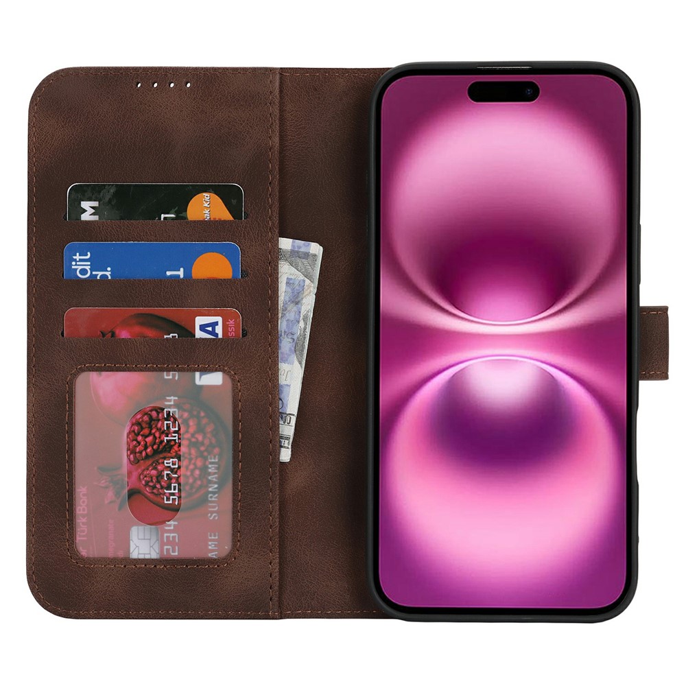 For iPhone 16 Plus Wallet Case Double Folded Edge Skin Touch PU Leather Flip Phone Cover – Dark Brown
