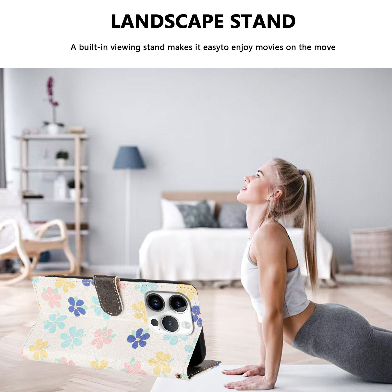 For iPhone 16 Pro Case Pattern Print PU Leather Wallet Phone Cover with Wrist Strap – Colored Flowers