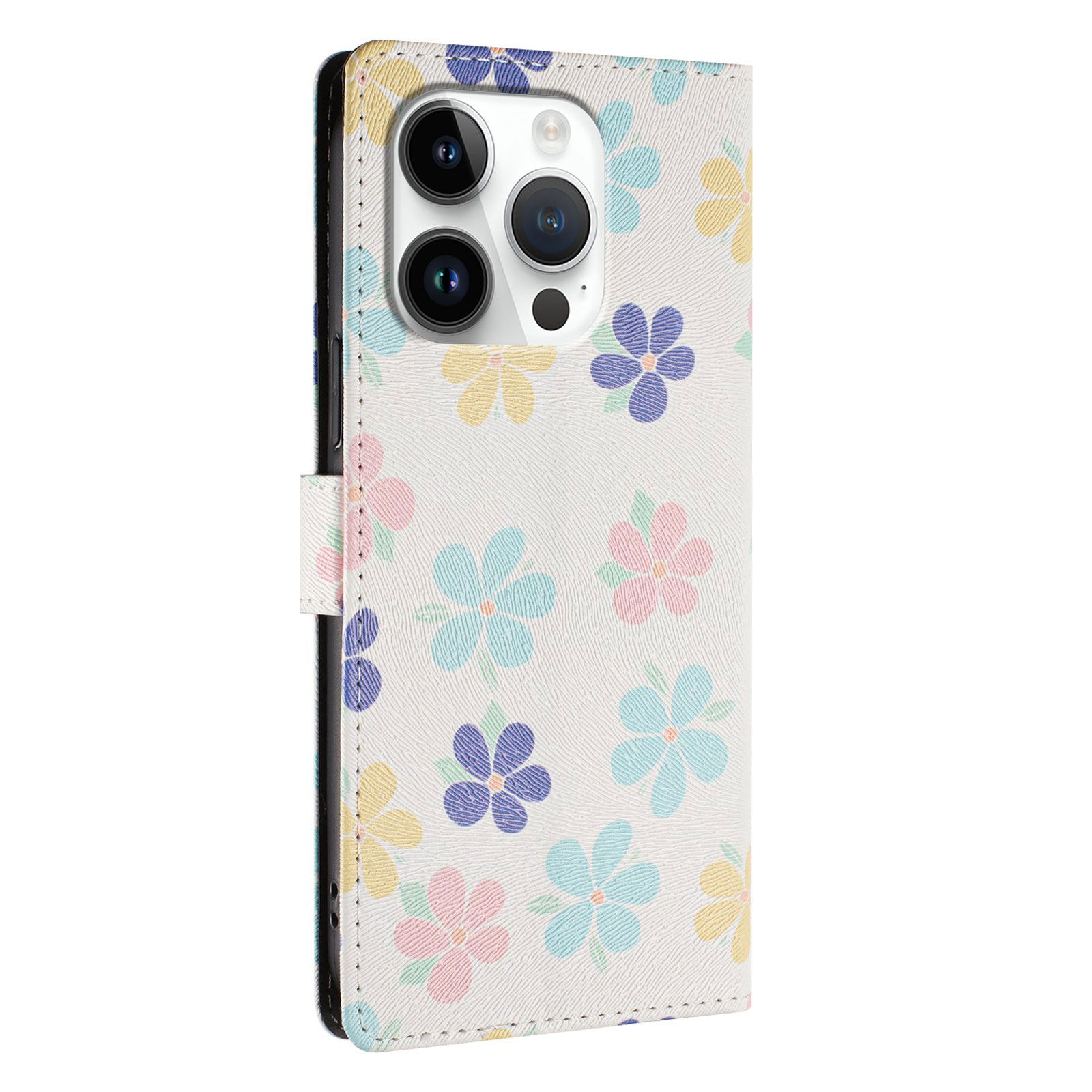 For iPhone 16 Pro Case Pattern Print PU Leather Wallet Phone Cover with Wrist Strap - Colored Flowers